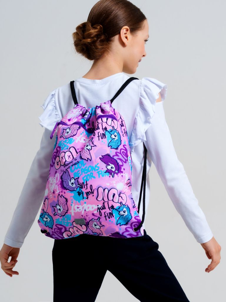 Мешок для сменной обуви из прочной водонепроницаемой ткани для девочки подростка. Мешок для сменки для школьницы с вместительным отделением, затягивающимся двумя шнурками. Дополнительный внешний карман застегивается на молнию.