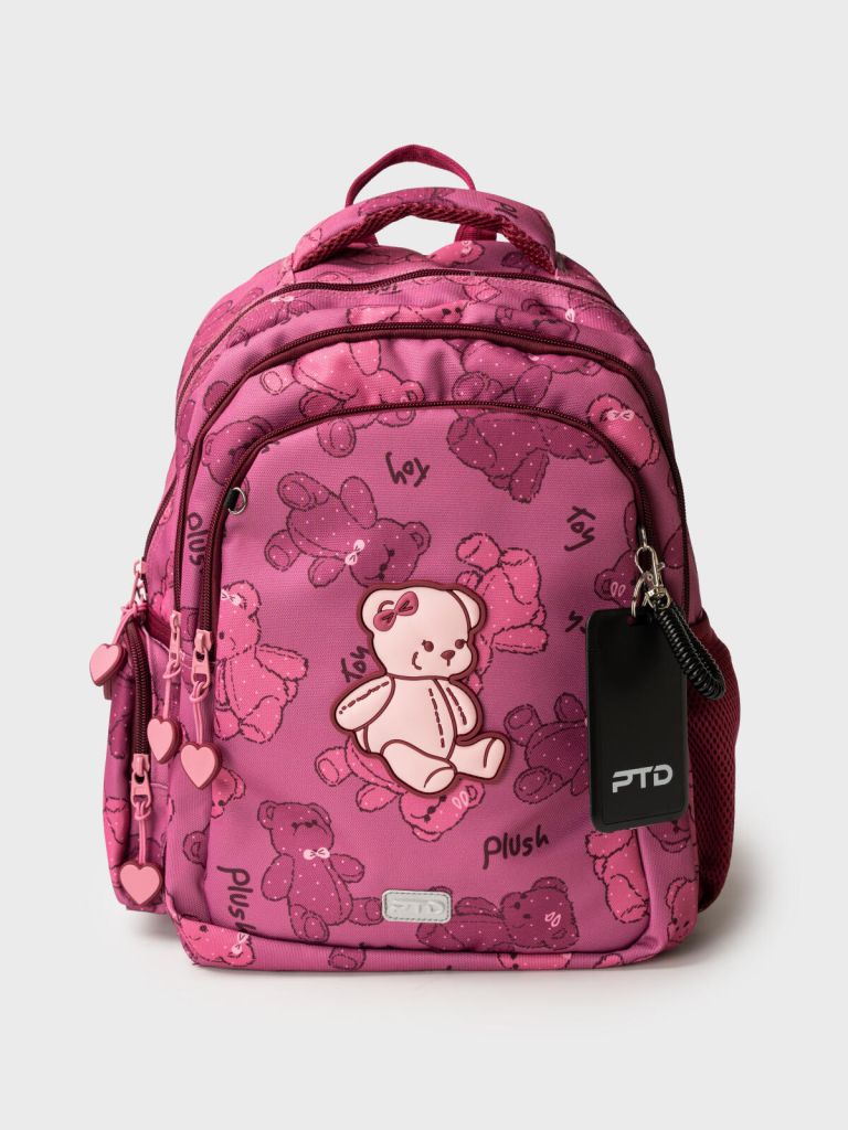 Трехсекционный рюкзак с ортопедической спинкой для девочки школьницы. Конструкция ортопедической вентилируемой спинки обеспечивает максимальный комфорт и позволяет снизить нагрузку на спину школьников и дошкольников. Широкие мягкие вентилируемые лямки регулируются по высоте, что делает рюкзак идеальным как для первоклассника, так и для детей из средней школы. Спереди лямки можно закрепить на застежку, чтобы они не спадали. Дно имеет уплотнительный вкладыш, который при необходимости можно не использовать. Снизу дна имеются резиновые "ножки", чтобы низ рюкзака не пачкался. Рюкзак имеет два основных отделения на молнии один большой карман спереди. Внутри имеется несколько отделений и кармашков для систематизации школьных принадлежностей. По бокам есть карманы: один - сетчатый, второй - на молнии. У рюкзака есть две ручки: одна - мягкая вентилируемая ручка для ношения в руках, вторая маленькая - для того, чтобы рюкзак можно было вешать на вешалку. Модель выполнена из водонепроницаемой ткани. Ранец имеет светоотражающие детали на лямках, по бокам, на переднем отделении, чтобы ребенка было хорошо видно в темноте со всех сторон. В подарок идет пластиковый чехол для пропуска на растягивающейся пружине. Пружина дает возможность спокойно приложить пропуск к турникету не снимая рюкзак. Ранец декорирован милым патчем Мишкой. Рюкзак в школу можно дополнить мешком для обуви и пеналом в том же дизайне. Размер рюкзака: 29*38*19 см. Вес рюкзака: 650 гр
