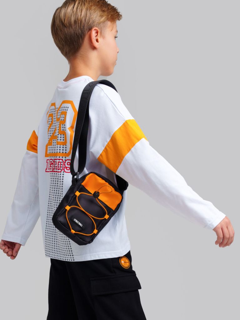 Текстильная сумка кросс-боди для мальчика-подростка. Регулируемый брендированный ремень. Основной отсек на молнии, сзади карман для транспортной карты. Спереди есть резиновый шнурок на утяжке - эта конструкция выглядит как декоративный элемент, но легко может удерживать маленькую бутылку воду. Параметры: высота - 18 см, ширина -13 см, глубина - 6 см.