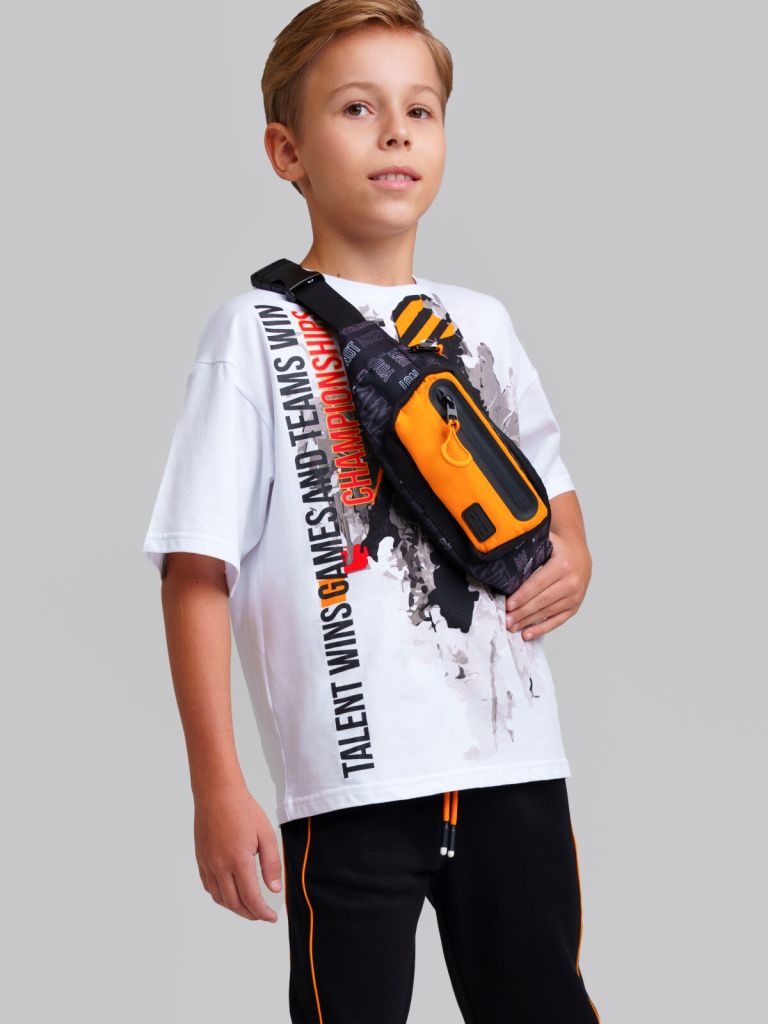Текстильная поясная сумка с принтом для мальчика-подростка. Регулируемый ремень. Основной отсек на молнии, спереди дополнительный карман на молнии. Внутри есть карман на молнии. Параметры: высота - 14 см, ширина - 33 см, глубина - 8 см.