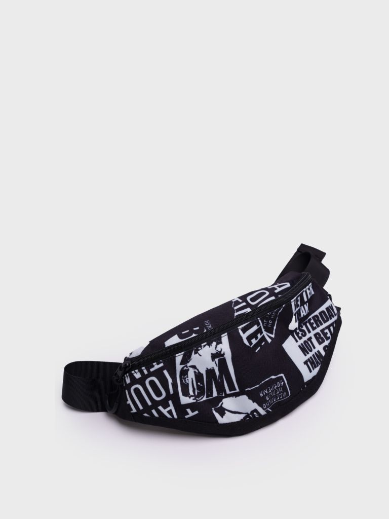 Стильная принтованная поясная сумка для мальчика-подростка в черно-белой гамме. Регулируемый ремень. Основной отсек на молнии. Внутри есть карман на липучке. Параметры: высота - 14 см, ширина -30 см, глубина - 8 см.