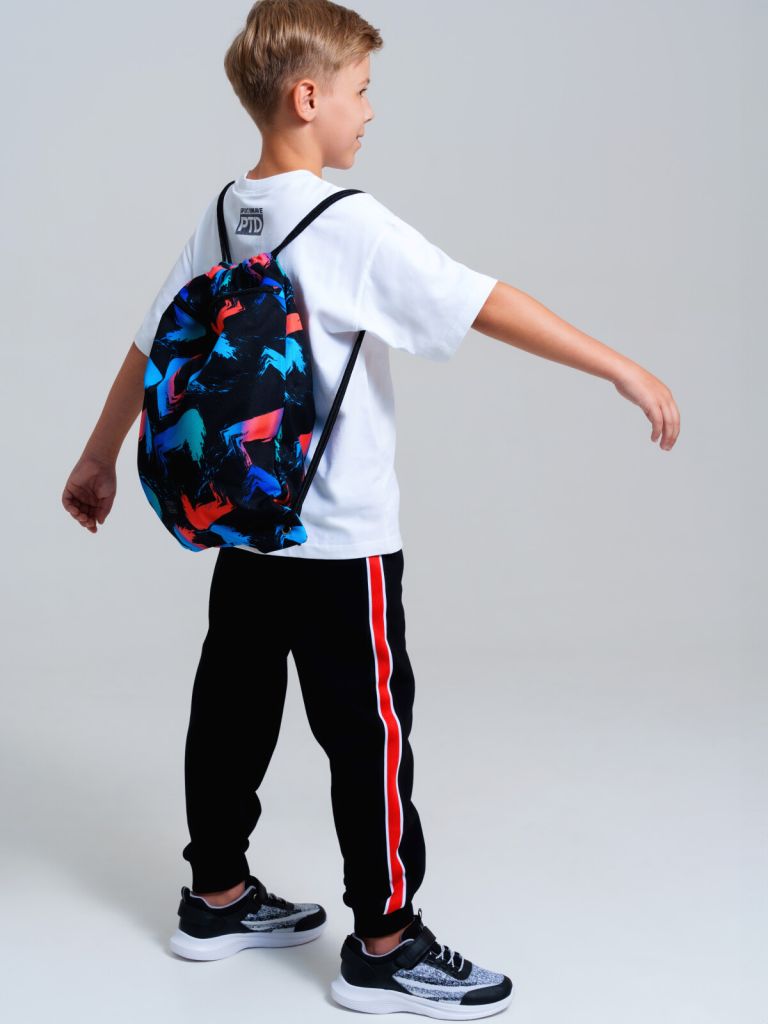 Мешок для сменной обуви из прочной водонепроницаемой ткани для мальчика подростка. Мешок для сменки для школьника с вместительным отделением, затягивающимся двумя шнурками. Дополнительный внешний карман застегивается на молнию.