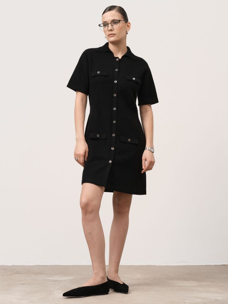 Классический отложной воротник, застёжка на пуговицы по всей длине и накладные карманы создают сдержанный, структурный образ. Короткий рукав делает платье универсальным для демисезонного периода.