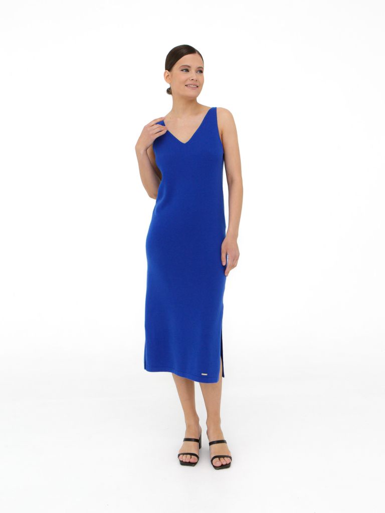 V-образный вырез, аккуратные бретели, боковой разрез для свободы движения. Минималистичный дизайн подчёркивает благородство материала.