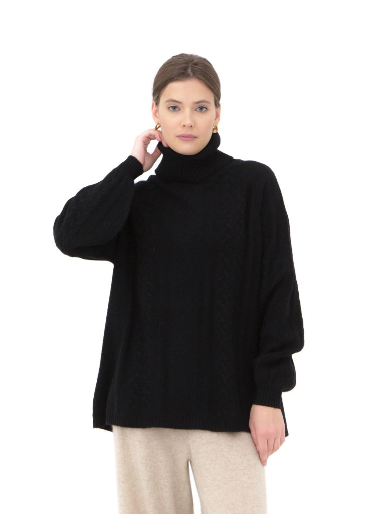 Лаконичный силуэт с объёмной посадкой. Фактурная вязка придаёт модели глубину и визуальный интерес. Высокий воротник-гольф обеспечивает дополнительный комфорт в холодное время года.