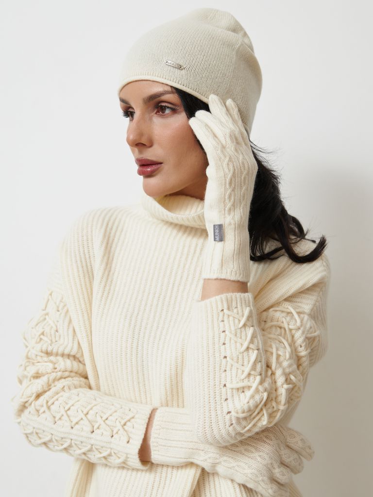 Элегантная вязаная шапка из натурального кашемира — идеальный аксессуар для холодного сезона. Лаконичный дизайн и благородный кремовый оттенок делают модель универсальной для повседневных и более утончённых образов.