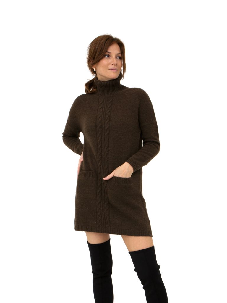 Элегантный женский джемпер-платье из пуха яка в стильном темно-коричневом цвете — идеальное решение для холодного времени года. Этот джемпер-платье сочетает в себе непревзойденное тепло, комфорт и модный дизайн. Высокий воротник-стойка и декоративные косы на передней части добавляют изделию утонченный стиль, а два удобных кармана делают его практичным для повседневной носки.