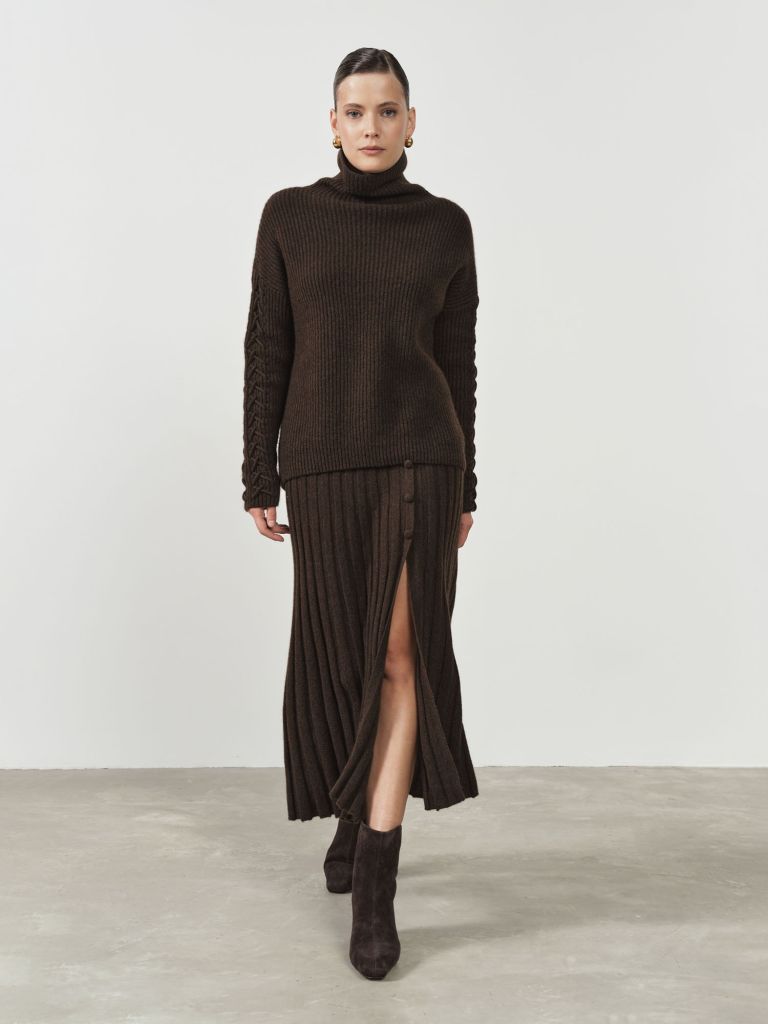 Эта длинная юбка из пуха яка — идеальное сочетание тепла, комфорта и элегантности. Выполненная из высококачественного пуха яка, она обеспечивает превосходную теплоизоляцию и мягкость, что делает ее незаменимой в холодное время года. Юбка имеет стильный ребристый узор, который визуально стройнит и подчеркивает фигуру. Особенностью модели является разрез на пуговицах, добавляющий образу динамичности и легкой интриги. Глубокий коричневый оттенок придает юбке универсальность, позволяя сочетать ее с различными элементами гардероба, как для повседневного, так и для более формального стиля. Эта юбка идеально подходит для создания утонченных и стильных образов, добавляя в ваш гардероб нотку роскоши и комфорта.