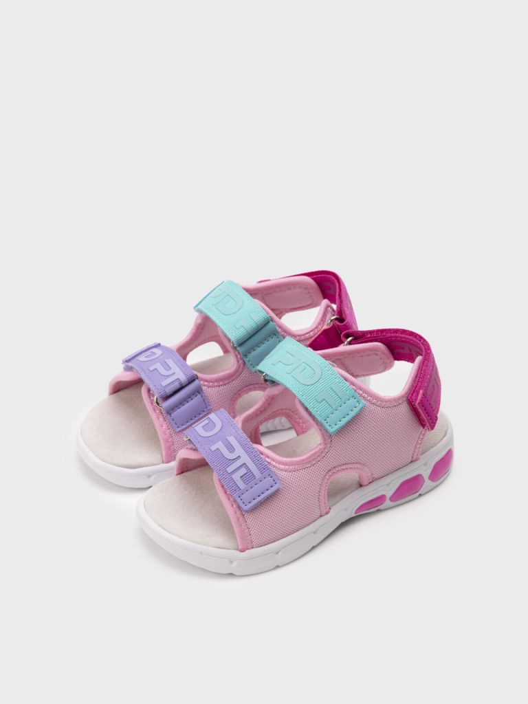Текстильные детские сандалии для девочки с огоньками. Сандалии выполнены из дышащего текстиля с фирменными тейпами. Стелька из свиной кожи. Текстильная подкладка c высоким содержанием хлопка обладает высокой гигроскопичностью. Удобные ремни с липучками позволяют регулировать обувь на любой подъем. Гибкая и легкая подошва из ЭВА имеет мигающие элементы flashlights.