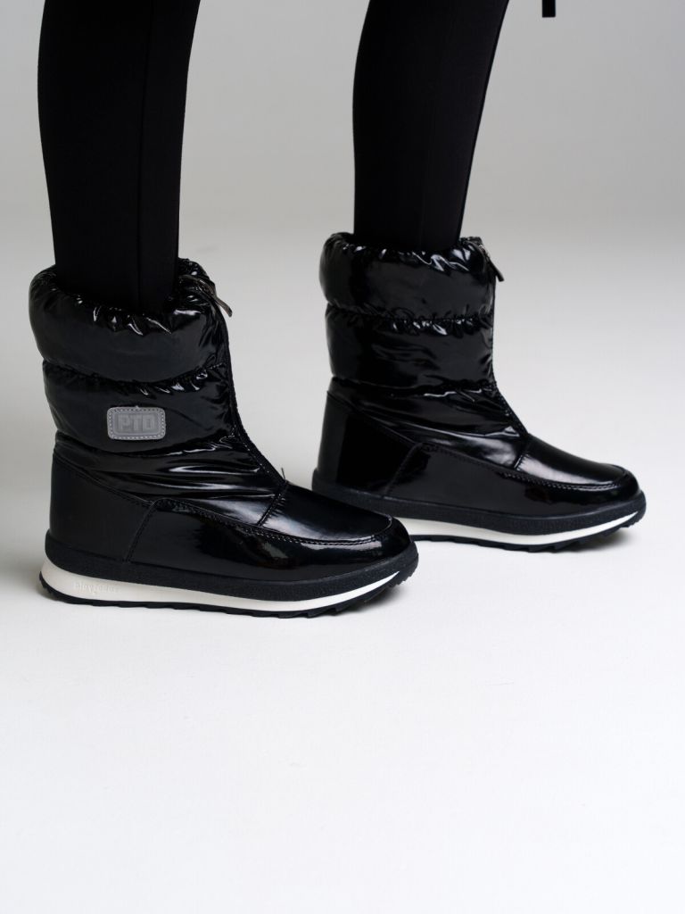 Верх из искусственной кожи и текстильного материала с водоотталкивающим покрытием. Подкладка и стелька выполнены из шерстяного меха 80%. Застежка на молнию. Глухой клапан в области застежки защищает от проникновения влаги внутрь. Формоустойчивый задник поддерживает стопу в правильном положении. Подошва имеет противоскользящий протектор. Съемная стелька позволяет хорошо просушить обувь после прогулки. Рекомендованный температурный режим от 0°С до -15°С.