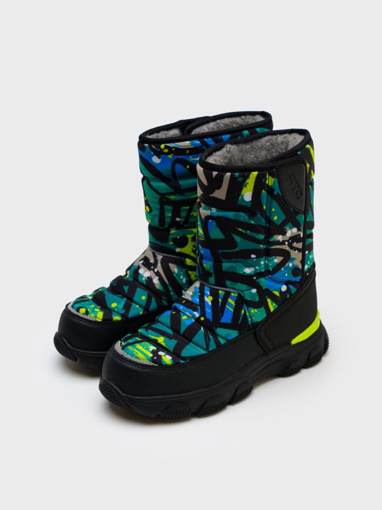 Сапоги зимние для мальчика подростка. Конструкция верха изготовлена с использованием мембранных технологий. Верх обуви имеет водоотталкивающее покрытие. Усиленная защита носочной части специальным материалом. Пяточная часть усилена резиновой деталью. Модель имеет светоотражающие элементы. Подкладка и съемная стелька выполнены из шерстяного меха 80%. Формоустойчивый задник поддерживает стопу в правильном положении. Подошва из терморезины имеет глубокий протектор и обладает хорошими противоскользящими свойствами. Для удобства обувания модель имеет липучку с защитным клапаном от влаги. Рекомендованный температурный режим ( зависит от активности ребенка и поддевы под обувь) от 0°С до -20°С.