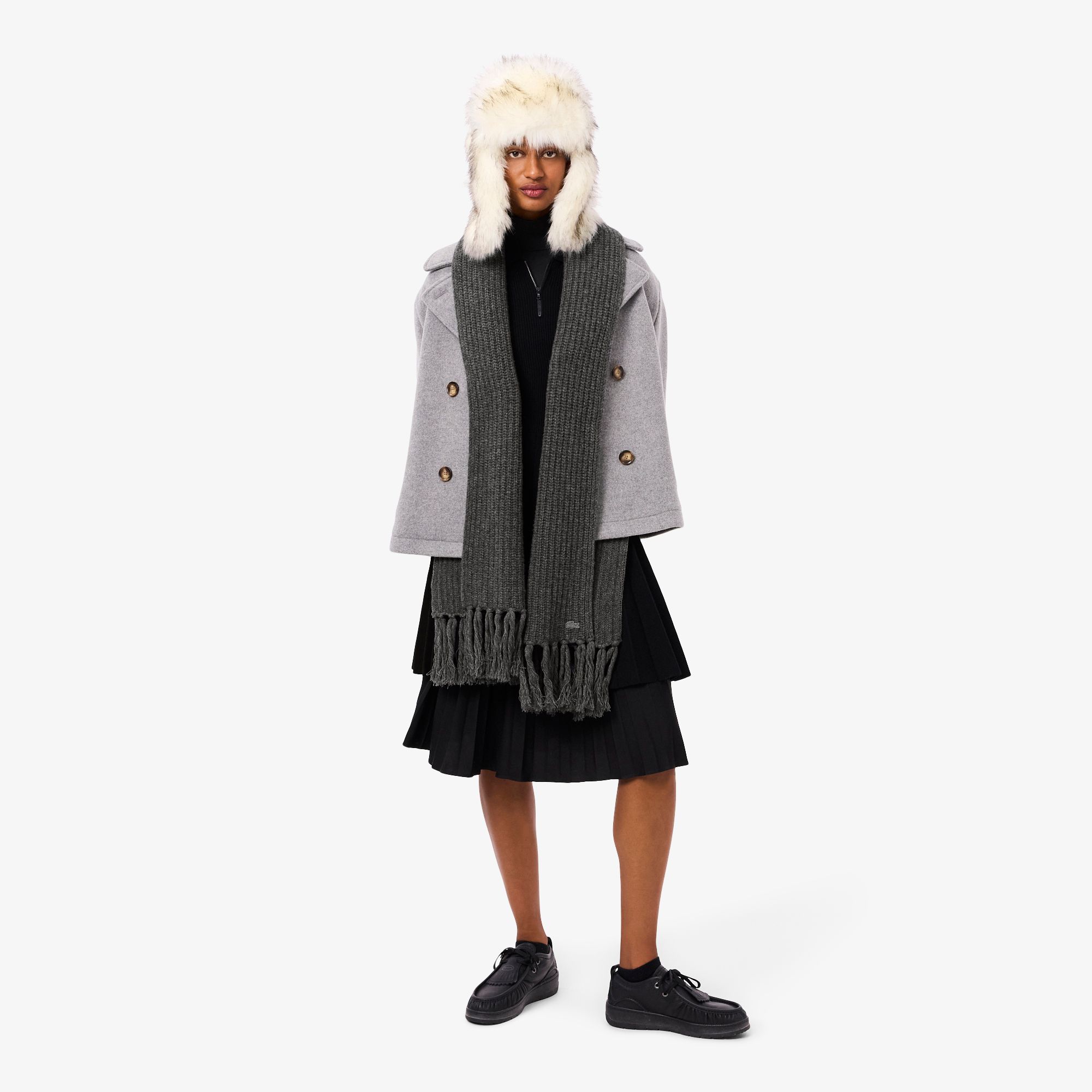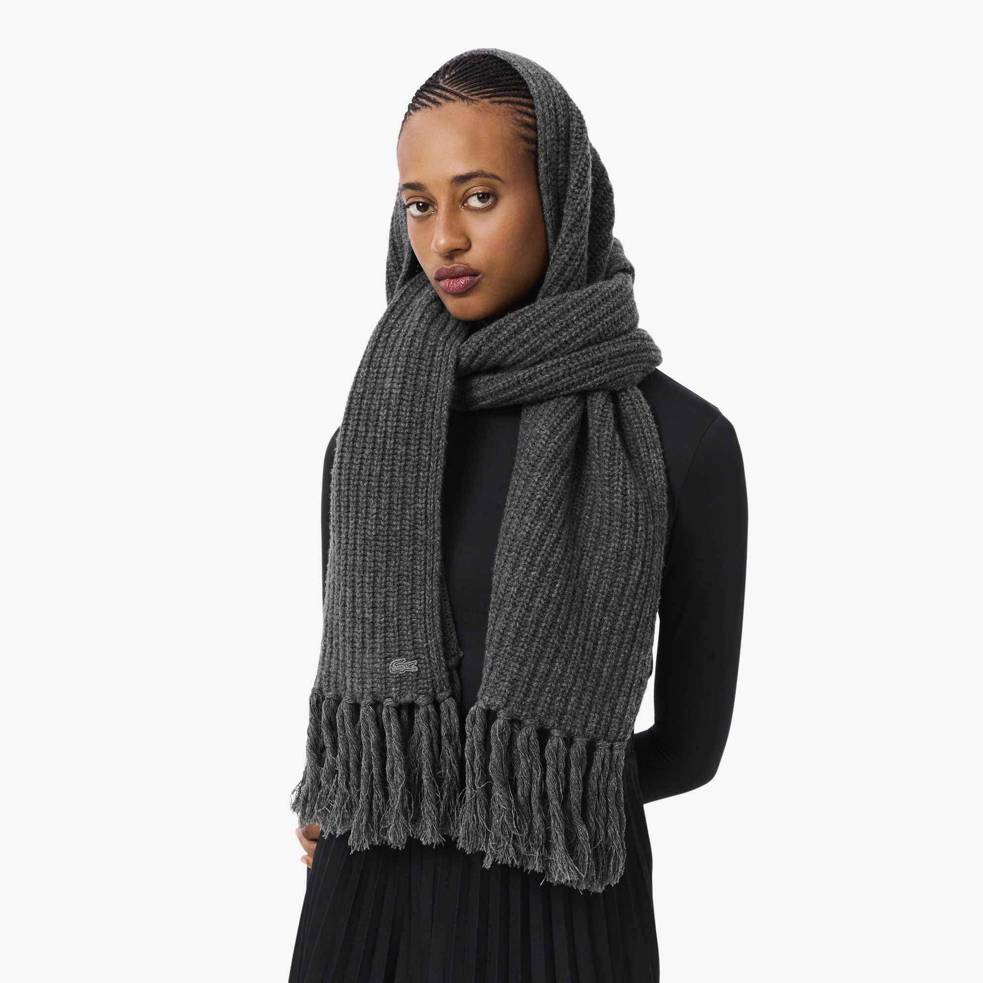 Шарф из кардной шерсти с бахромой \ Кардная шерсть из экологически чистых источников для животных \ Трикотаж с перламутровыми ребрами \ Концы с бахромой \ Плотный трикотаж 7-го калибра \ Размеры: L70 ”x W13.8” / L178 x W35 см (без учета бахрома) \ Вышитый