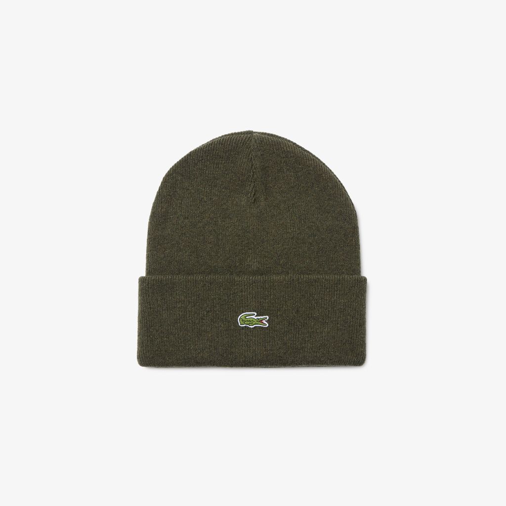 Шерстяная шапочка с манжетами \ Подвернутый край: \ Вышитый крокодил спереди: \ Переработанная трикотажная шерсть \ Это изделие большого размера. \ Трикотаж из переработанной шерсти\манжет\логотип посередине\материал: 68% переработанная шерсть 26% перера