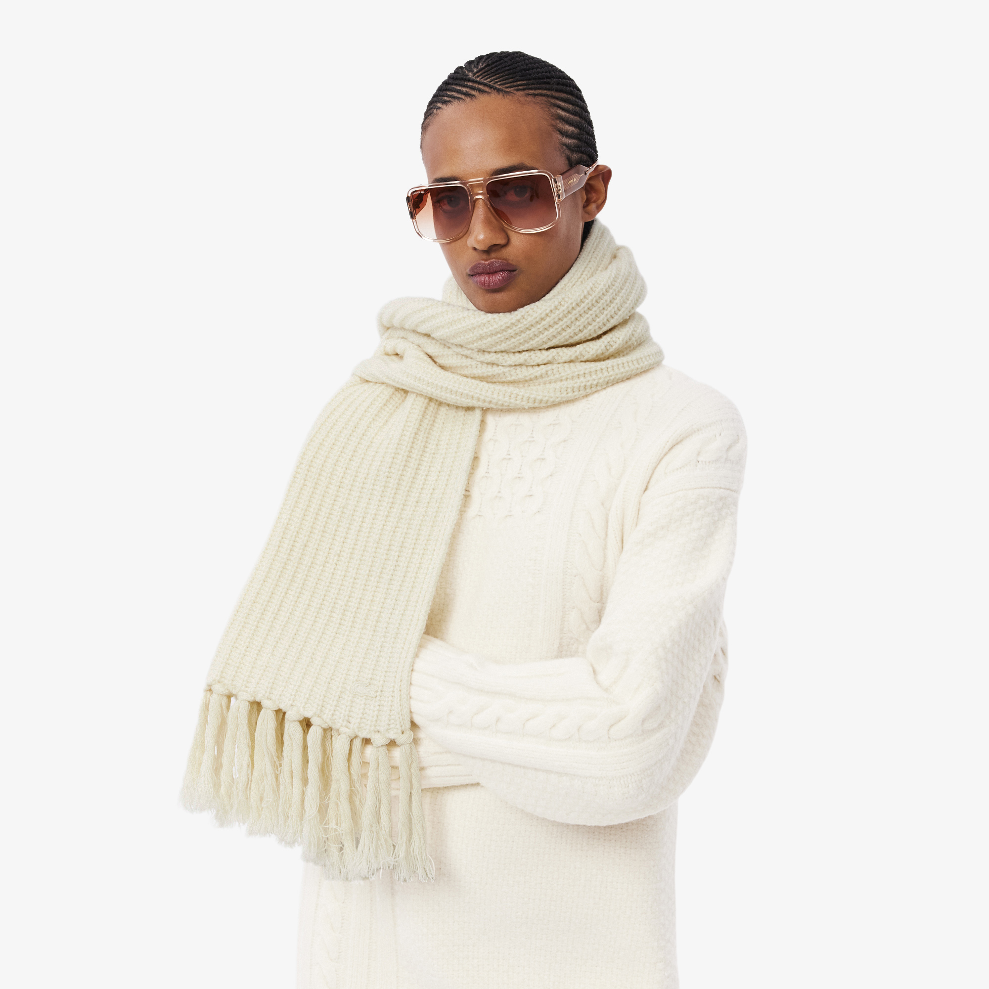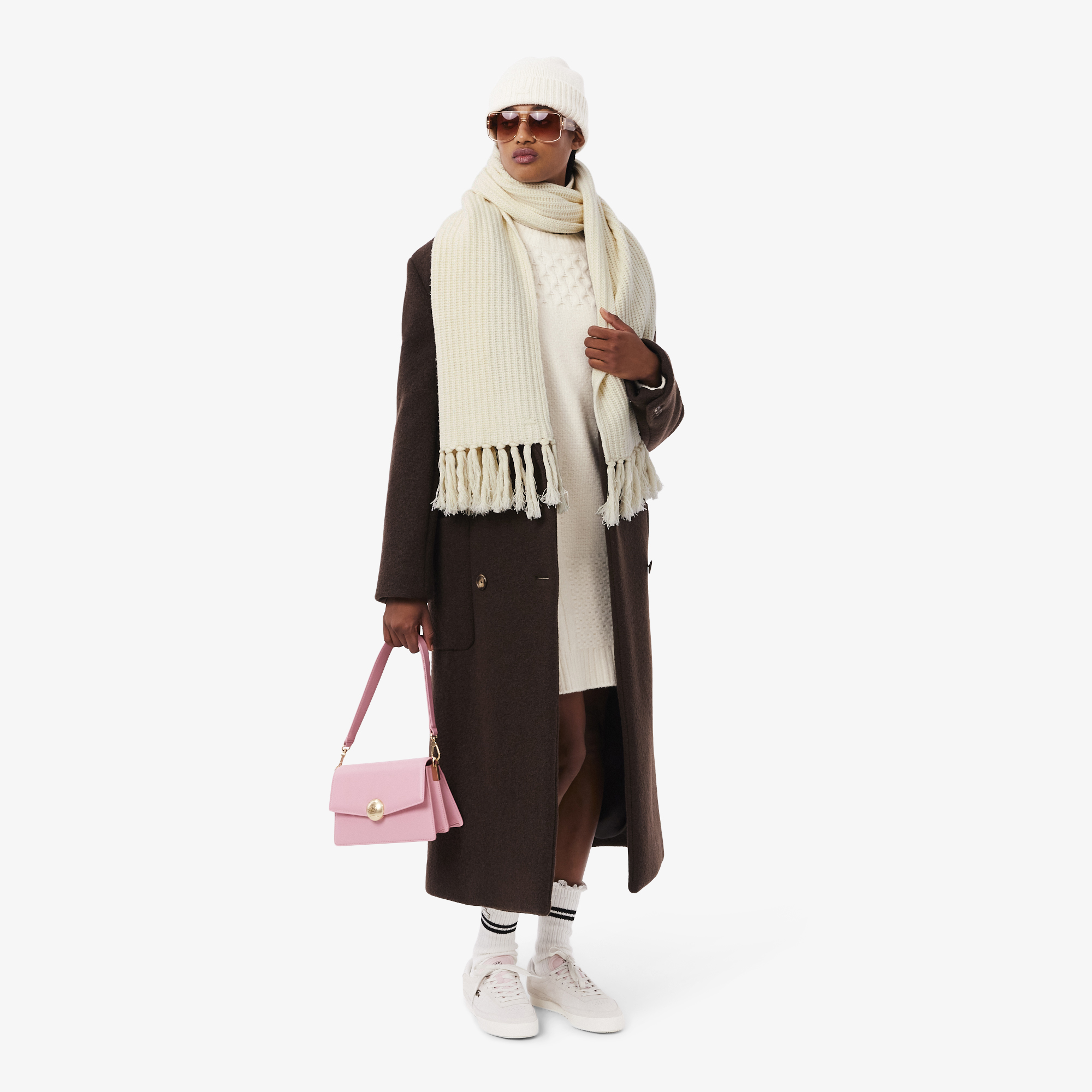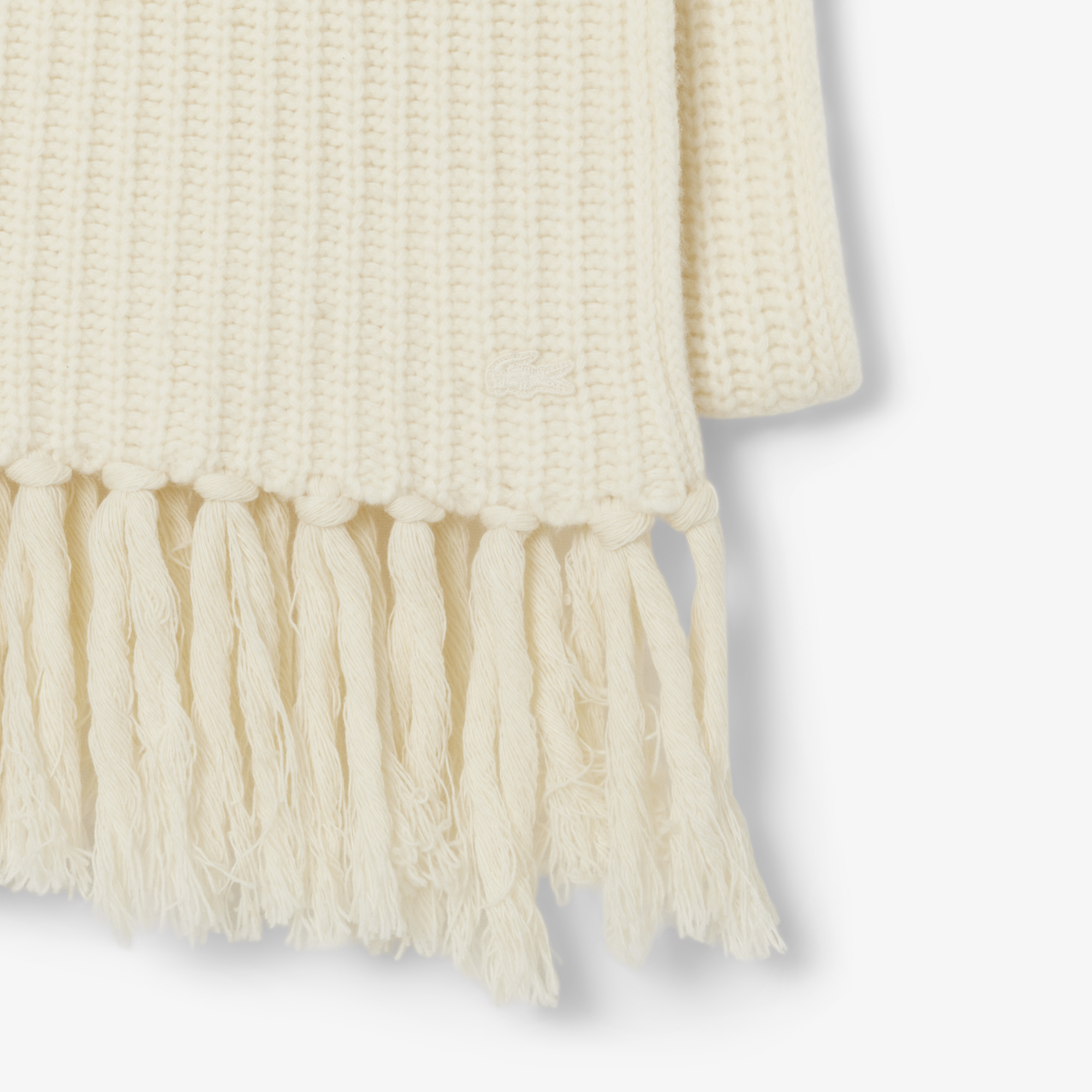 Шарф из кардной шерсти с бахромой \ Кардная шерсть из экологически чистых источников для животных \ Трикотаж с перламутровыми ребрами \ Концы с бахромой \ Плотный трикотаж 7-го калибра \ Размеры: L70 ”x W13.8” / L178 x W35 см (без учета бахрома) \ Вышитый