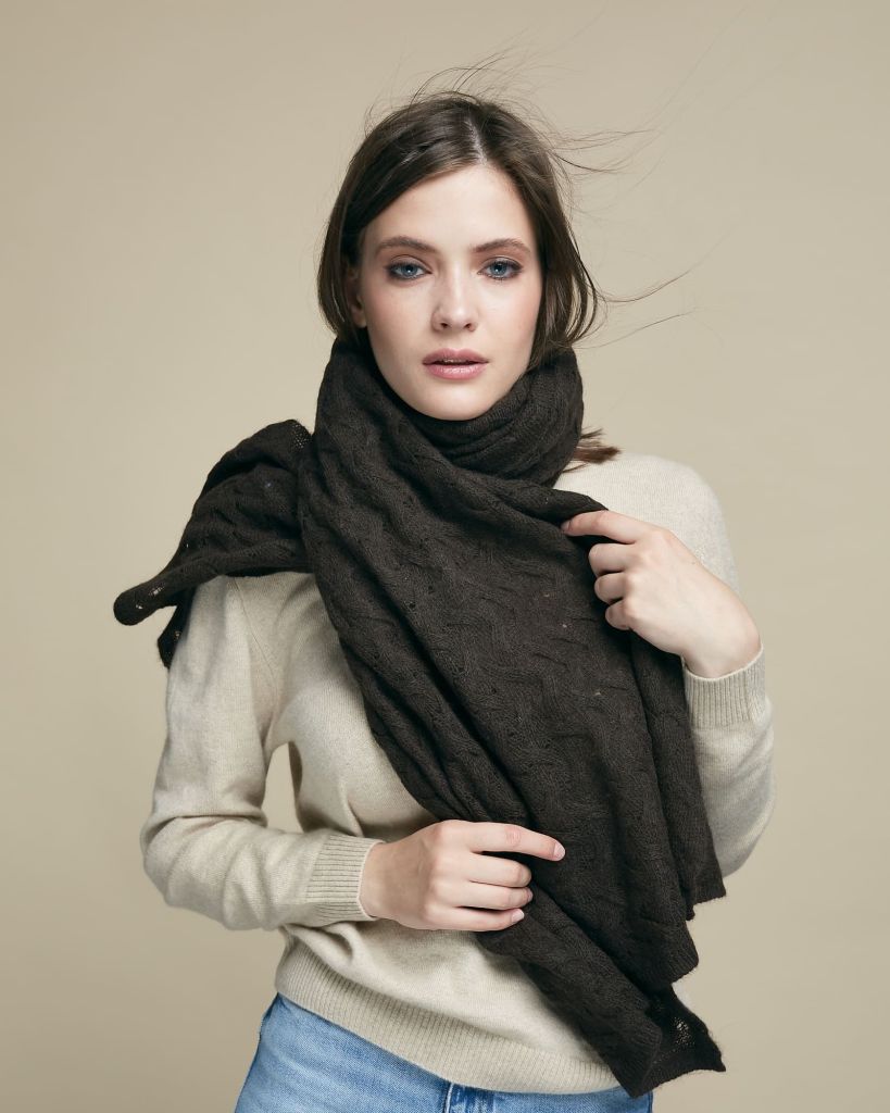 Нежный палантин в шоколадном оттенке — элегантный аксессуар, который добавит утончённости любому образу. Модель выполнена с изысканным ажурным узором, создающим лёгкую текстуру и воздушность. Благодаря 100% пуху яка палантин невероятно мягкий, лёгкий и отлично сохраняет тепло, оставаясь при этом дышащим. Универсальный размер позволяет носить его разными способами: как шарф, накидку или лёгкую шаль. Идеально подойдёт как для повседневных комплектов, так и для особых случаев.