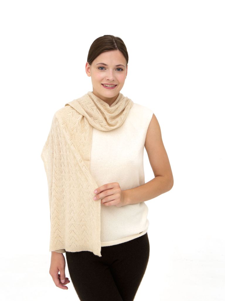 Ажурный палантин из нежнейшего 100% кашемира с вязкой "ёлочкой". Натуральные оттенки кашемира являются базовыми, их легко сочетать с разными цветами Вашей верхней одежды. Палантин легкий и невесомый, в то же время обеспечивает тепло, терморегуляцию и комфорт. Размер палантина составляет 39*140 см.