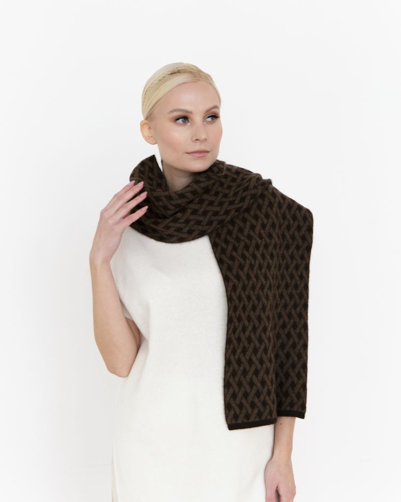 Cтрогий шарф из пуха яка универсален. Подчеркнет строгость образа как прекрасного пола, так и солидность сильного пола. Шарф представлен в темно-коричневом оттенке с орнаментом, станет идеальным заключающим деталью многих образов.