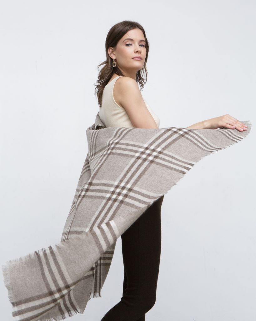 Теплый шерстяной платок с классическим клетчатым узором. Натуральный материал мягко укутывает и согревает в прохладную погоду. Легко сочетается с повседневными и элегантными образами. Идеальный аксессуар для стильного и комфортного лука.
