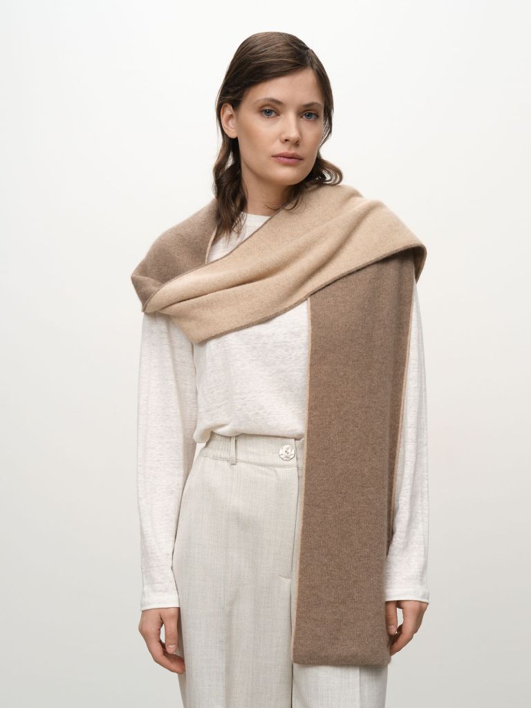 Лаконичный двусторонний дизайн позволяет носить шарф разными способами, создавая как спокойные, так и более выразительные сочетания. Минималистичный стиль делает аксессуар универсальным для любого гардероба.