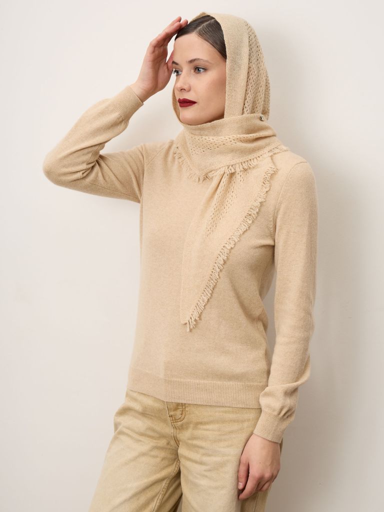 Воздушная косынка из 100% монгольского кашемира в бежевом оттенке. Мягкая, тёплая, гипоаллергенная и универсальная — подходит для ношения на голове, шее или плечах. Лёгкая и изысканная, она станет премиальным акцентом вашего гардероба.