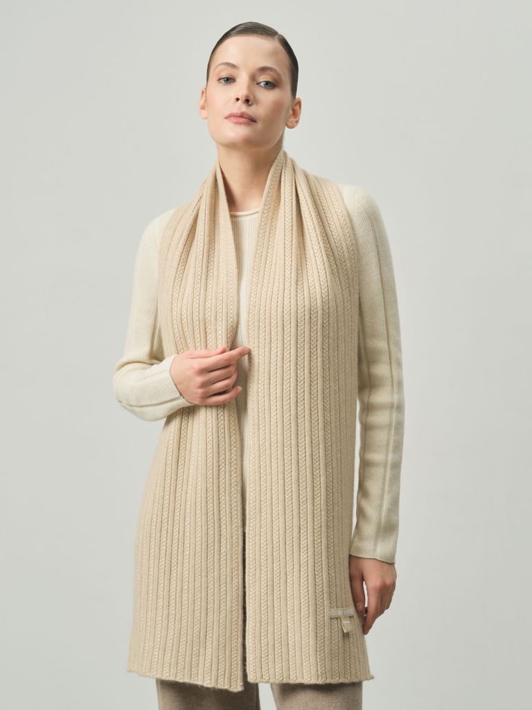 Элегантный шарф из натурального кашемира в универсальном бежевом оттенке. Модель выполнена в фактурной вязке, которая придаёт изделию благородный внешний вид и делает его стильным акцентом в повседневных и классических образах. Мягкий и лёгкий, шарф комфортно драпируется и подходит для ношения в течение всего холодного сезона.