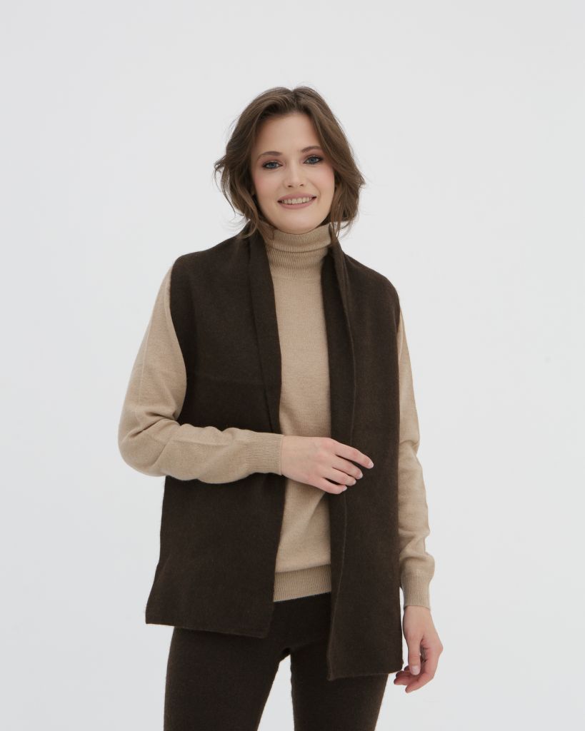 Шарф из пуха яка UL в темно-коричневом оттенке — стильный и практичный аксессуар, который сочетает природное тепло и элегантную лаконичность. Мягкое и лёгкое полотно красиво драпируется, создавая аккуратный силуэт и ощущение уюта. Благородный натуральный оттенок делает шарф универсальным дополнением как повседневных, так и более классических образов.