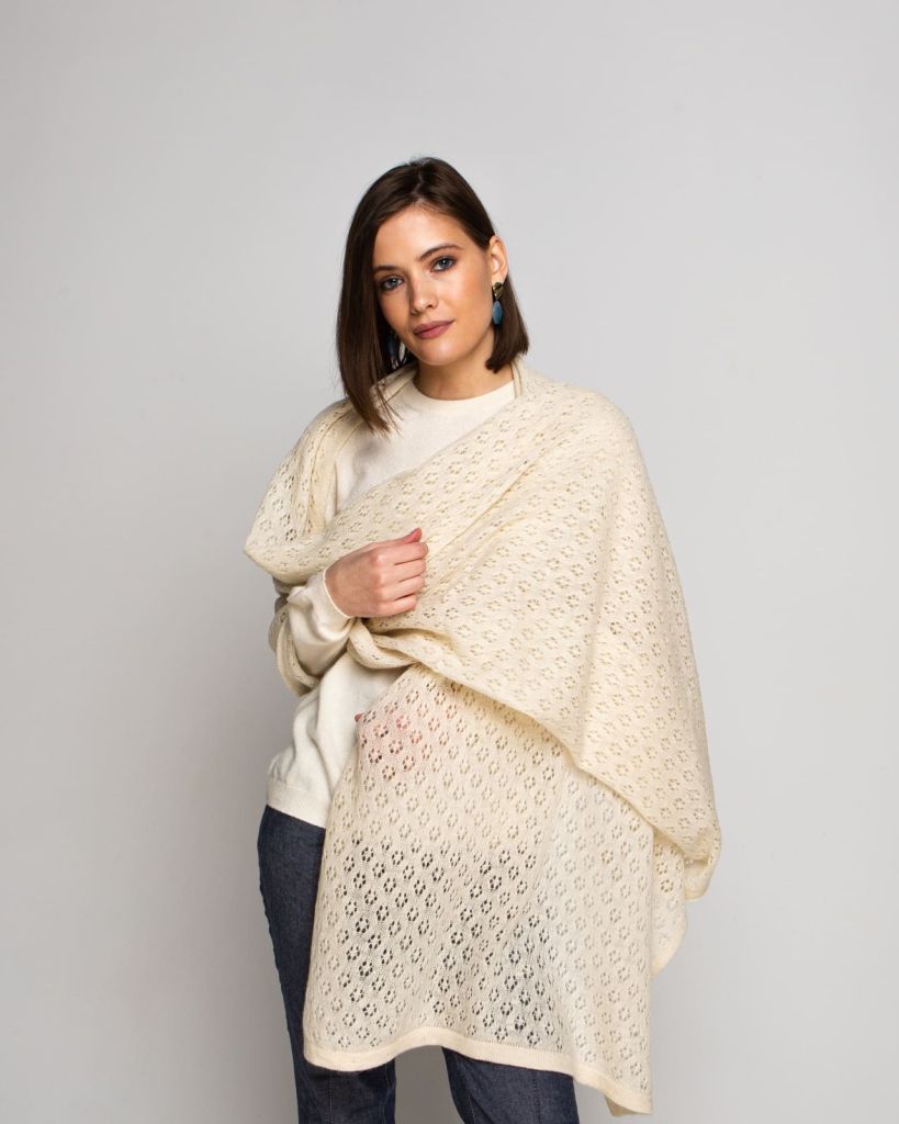 Классическая прямоугольная форма с аккуратной вязкой и лёгкой фактурой. Минималистичное исполнение без декоративных элементов подчёркивает натуральность материала. Полотно мягко драпируется, образуя красивые складки и сохраняя аккуратный внешний вид.