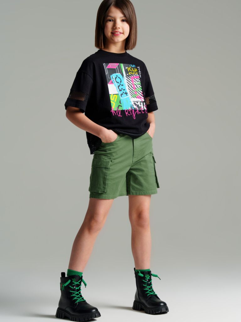 Шорты из твила для девочки. Застежка на пуговицу, пояс с внутренней утяжкой. Функциональные накладные карманы с клапанами.