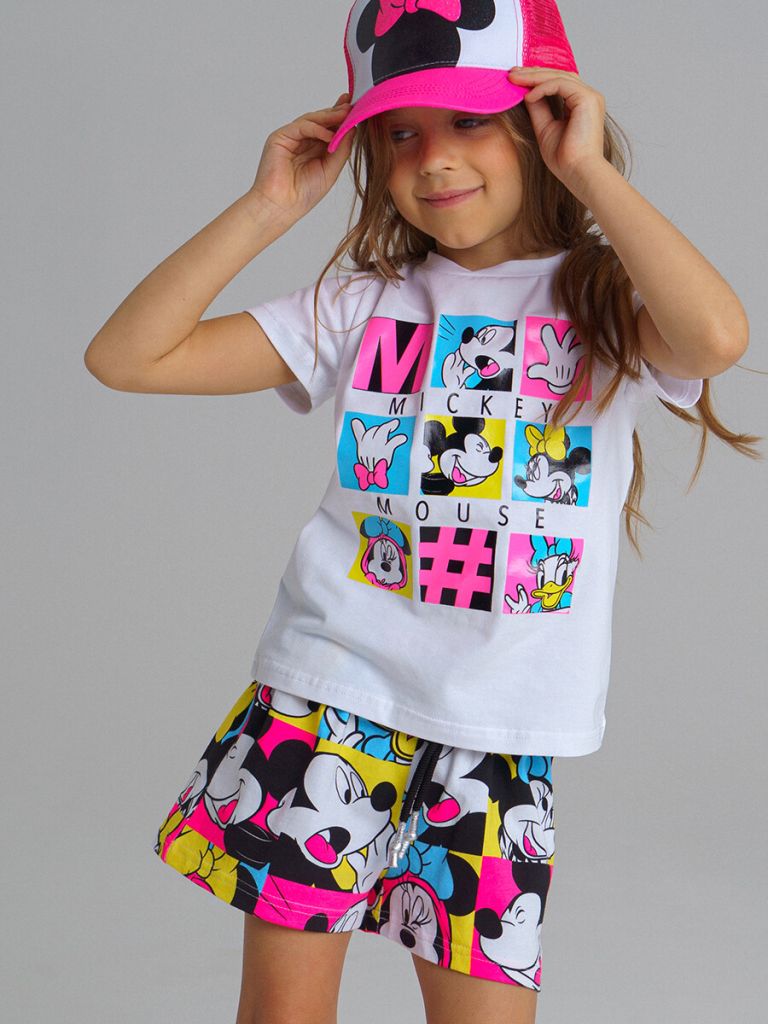Шорты трикотажные с принтом Disney. Размер изделия на фото - 110, параметры модели (см): рост 110, обхват груди-талии-бедер: 58-47-61. Высокое содержание хлопка 95%. Благодаря наличию эластана в составе ткани изделие проще в уходе и держит форму. Эластичный пояс со шнурком.