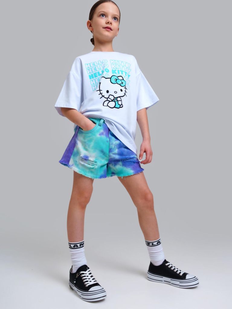 Шорты джинсовые для девочки подростка. Шорты свободного силуэта. Пояс с внутренней утяжкой. Застежка на молнию и болт. Функциональные карманы. Модный принт Тай-дай.