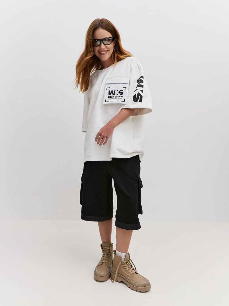 Шорты из дышащего хлопка. Свободный силуэт, широкий пояс и накладные карманы из мембраны создают пропорционально правильный объём и контраст относительно ноги ниже колена.