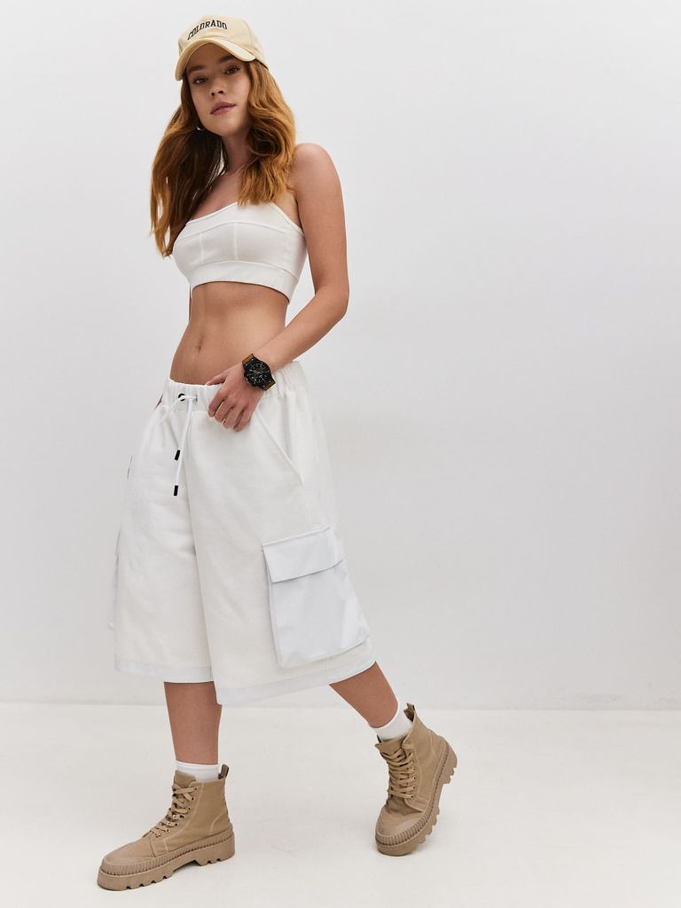 Шорты из дышащего хлопка. Свободный силуэт, широкий пояс и накладные карманы из мембраны создают пропорционально правильный объём и контраст относительно ноги ниже колена.