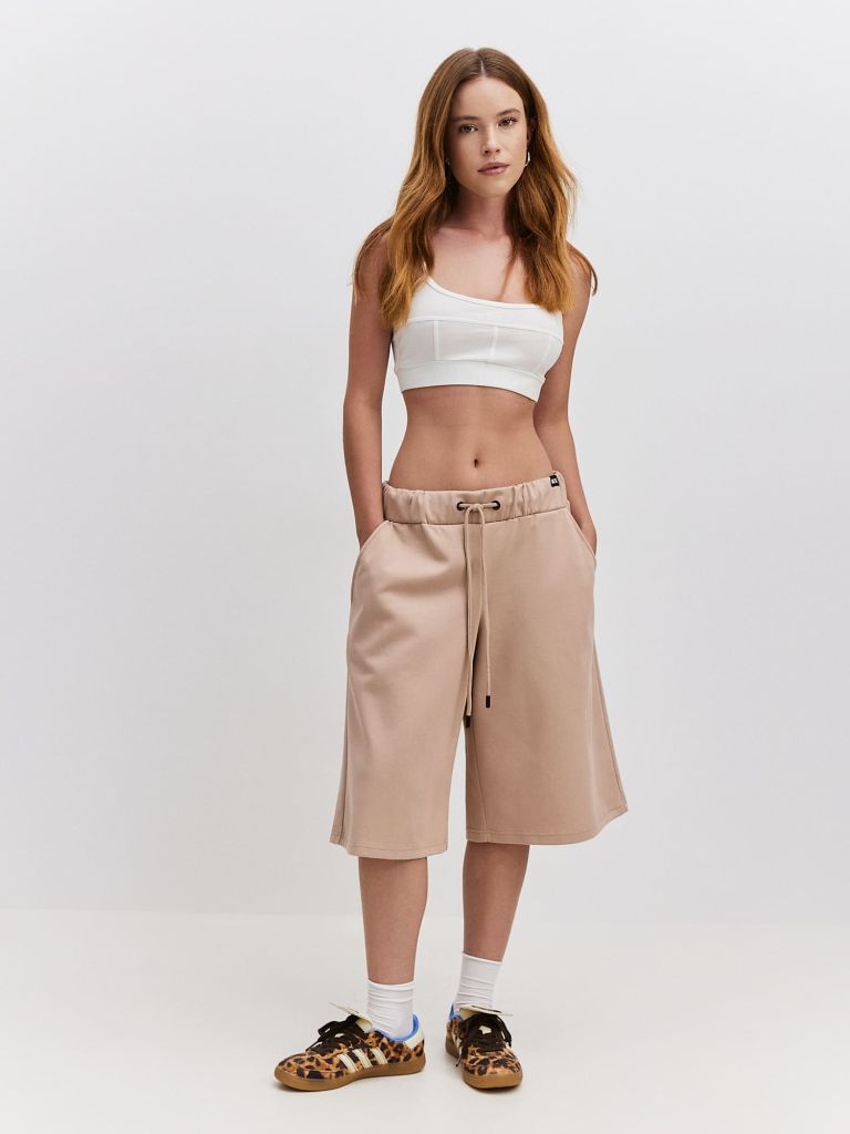Шорты из дышащего хлопка. Свободный силуэт и широкий пояс создают пропорционально правильный объём и контраст относительно ноги ниже колена.