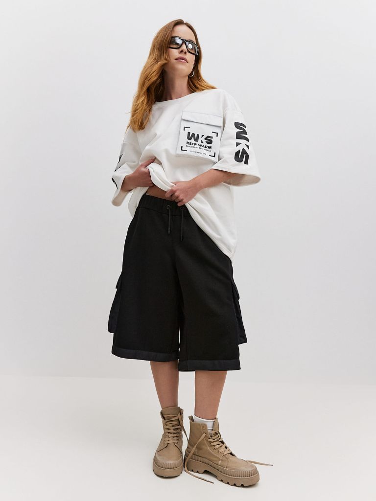 Шорты из дышащего хлопка. Свободный силуэт, широкий пояс и накладные карманы из мембраны создают пропорционально правильный объём и контраст относительно ноги ниже колена.
