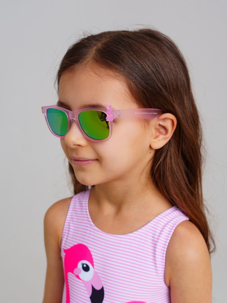 Солнцезащитные очки с фильтром Cat3 детские для девочки. Ширина оправы - 126мм, длина дужки - 124мм. Обхват головы 50-52см. Тёмные фильтры блокируют 85% солнечных лучей такие очки эффективны для защиты глаз в тропиках, у моря и в горах. Очки транспортируются в картонной коробке. В комплект входит фирменный текстильный чехол из микрофибры, с помощью которого легко ухаживать за изделием.