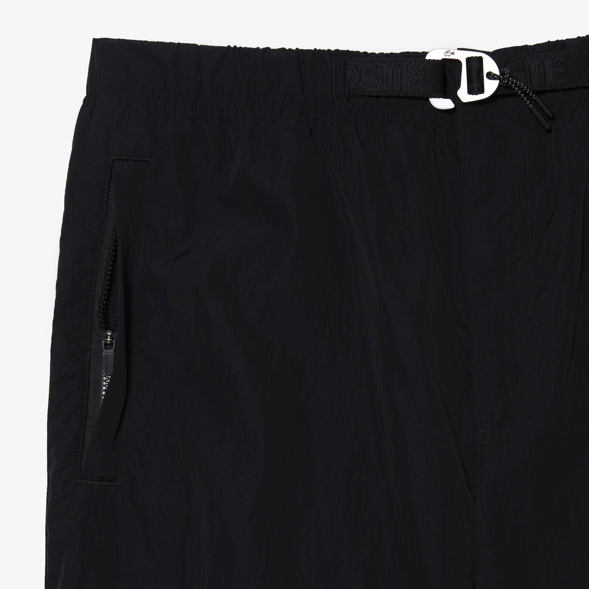 Регулируемая талия с контрастным ремешком;\Водоотталкивающая ткань;\Тафта из переработанного полиэстера;\Прорезные карманы по бокам;\Потайной карман сзади;\Силиконовый значок крокодила в тон изделия\Материал: 100% переработанный полиамид