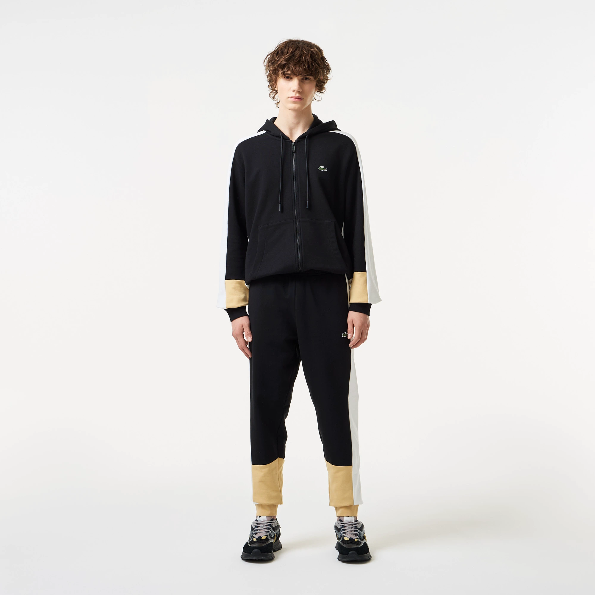 Пояс с потайной кулиской\Прорезные карманы\Цветовые блоки\Вышитый логотип\Материал: 80% органический хлопок 20% переработанный полиэстер\Рост модели 190 см, размер одежды 4-M