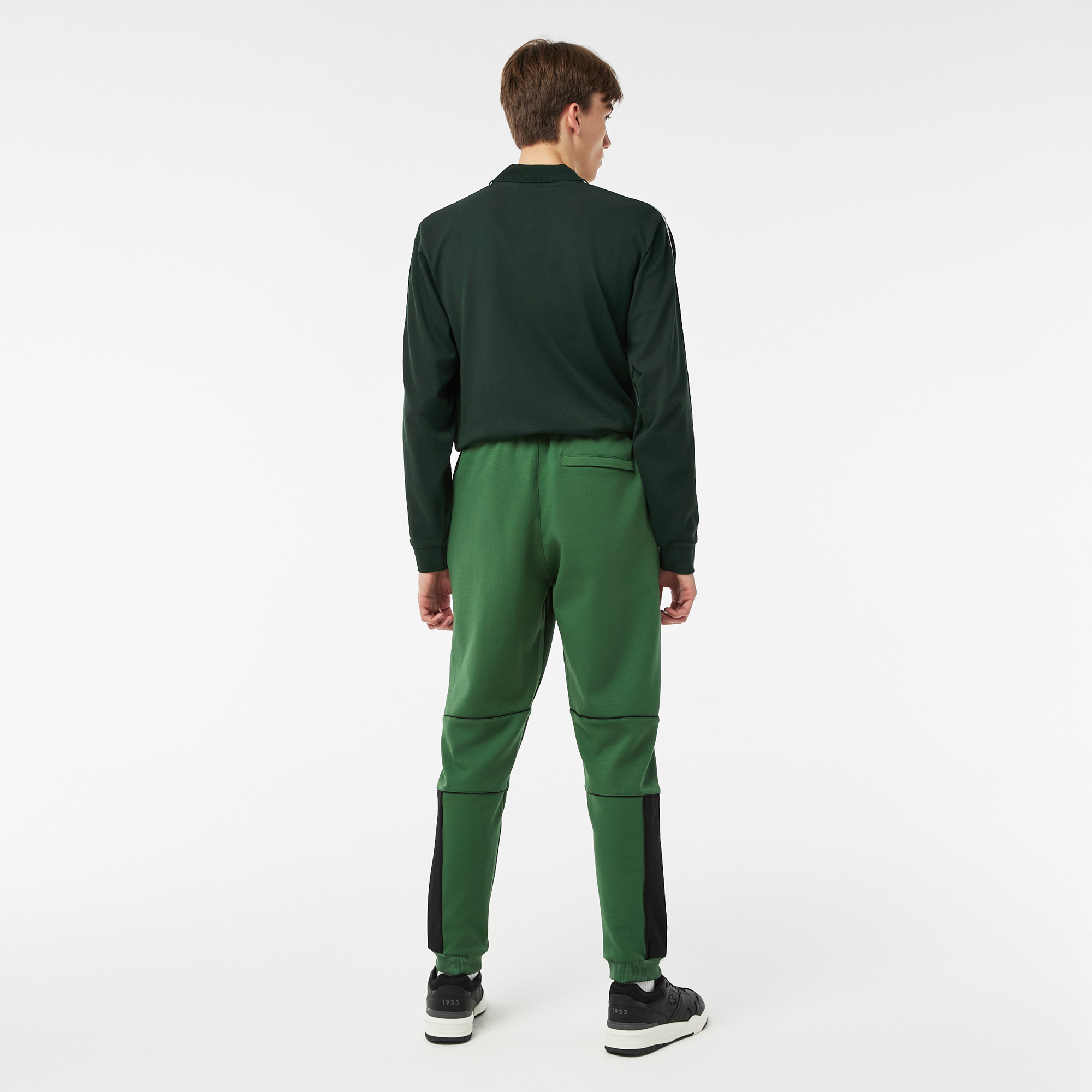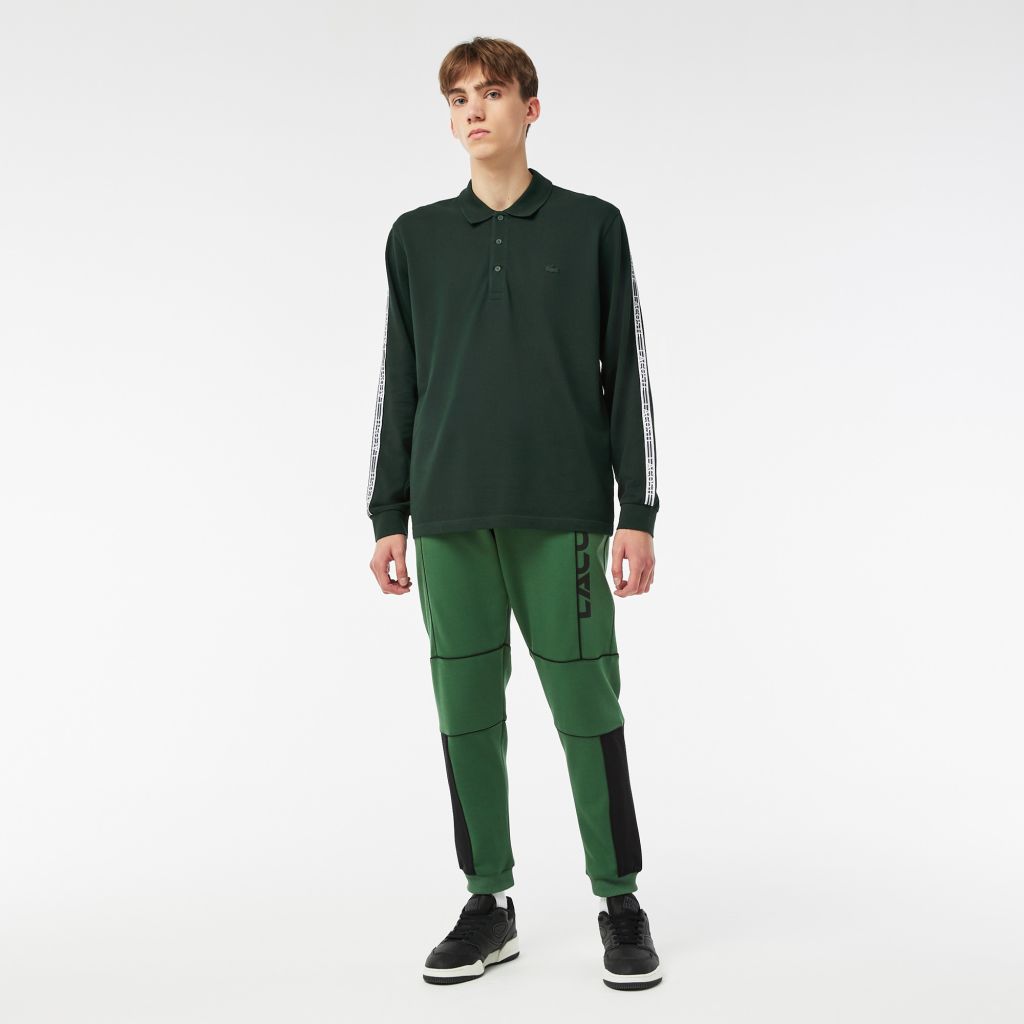 Эластичный шнурок на талии;\Прорезные карманы;\Надпись "Lacoste" на штанине;\Эластичные манжеты;\Вышитый логотип в тон изделия\Материал: 78% хлопок 17% полиэстер 5% эластан