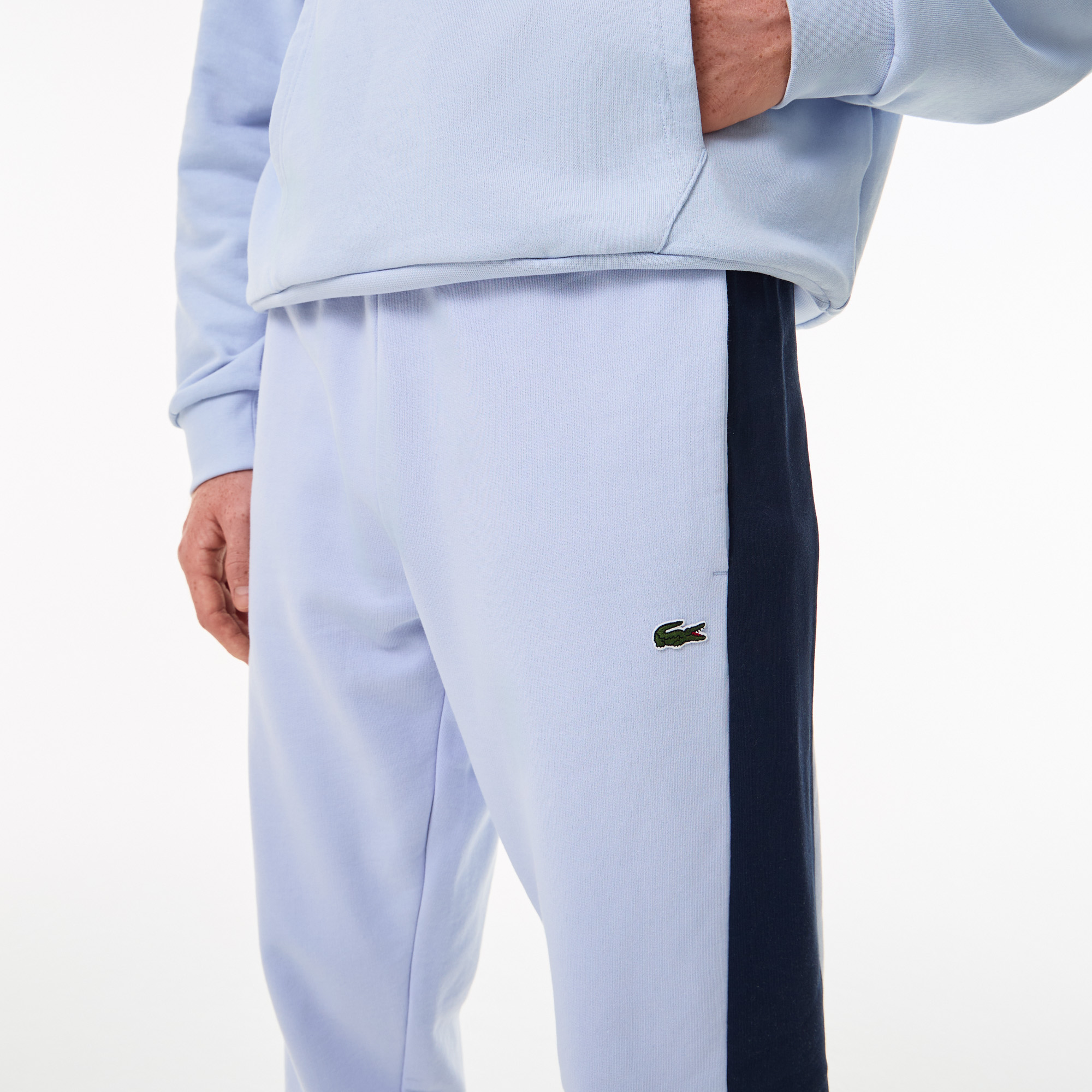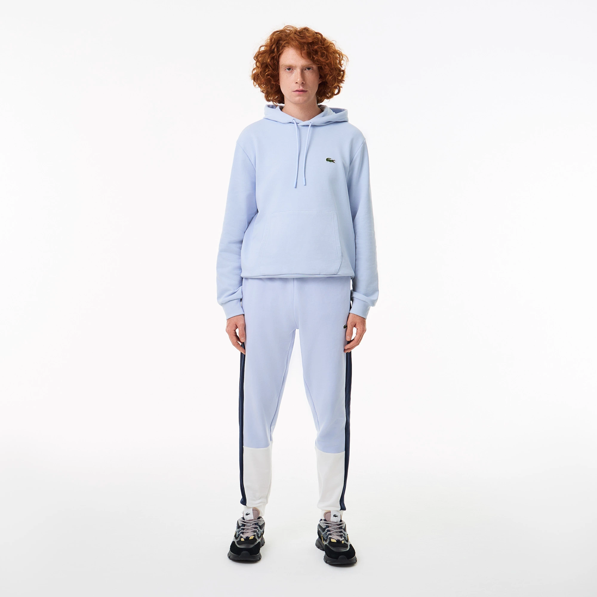 Пояс с потайной кулиской\Прорезные карманы\Цветовые блоки\Вышитый логотип\Материал: 80% органический хлопок 20% переработанный полиэстер\Рост модели 190 см, размер одежды 4-M