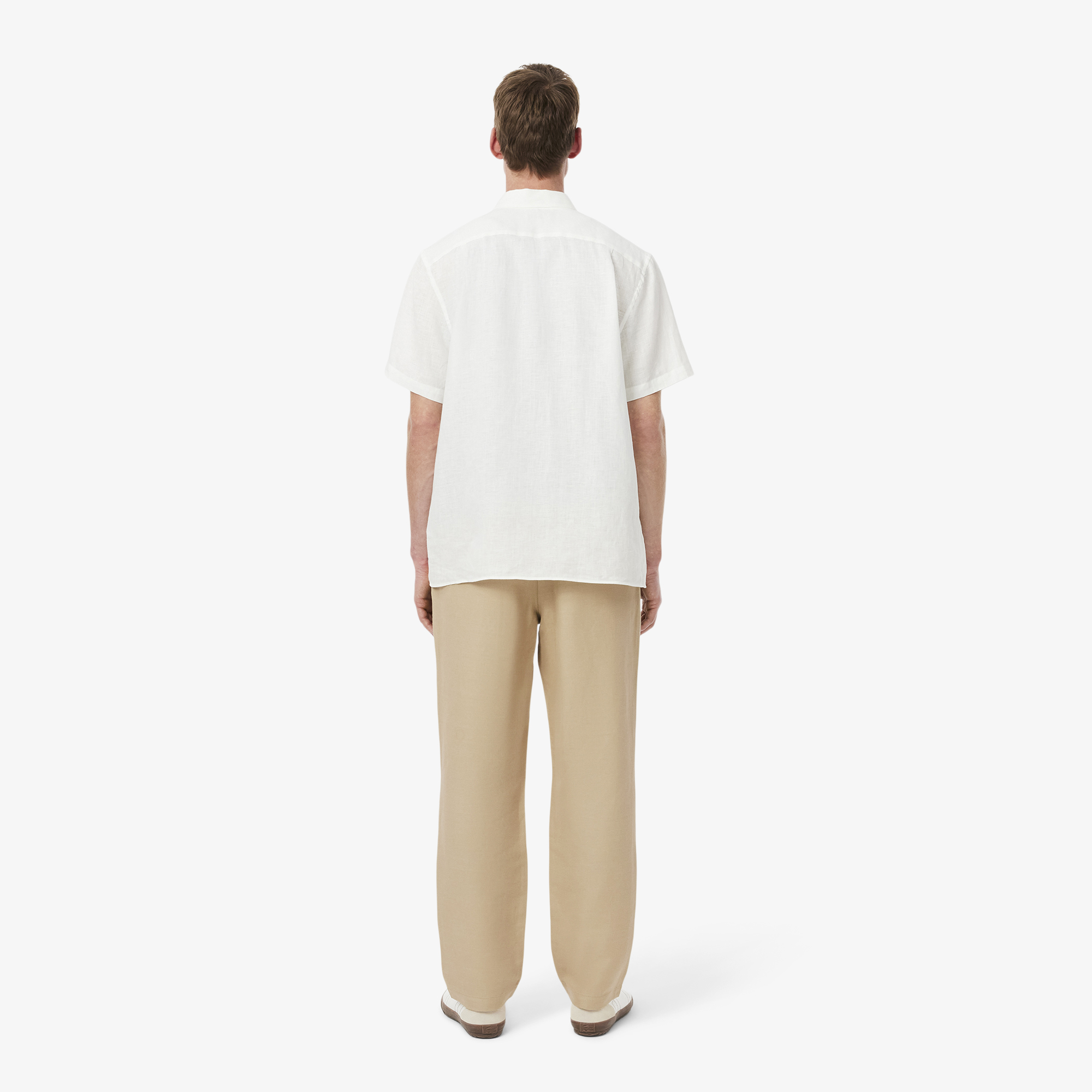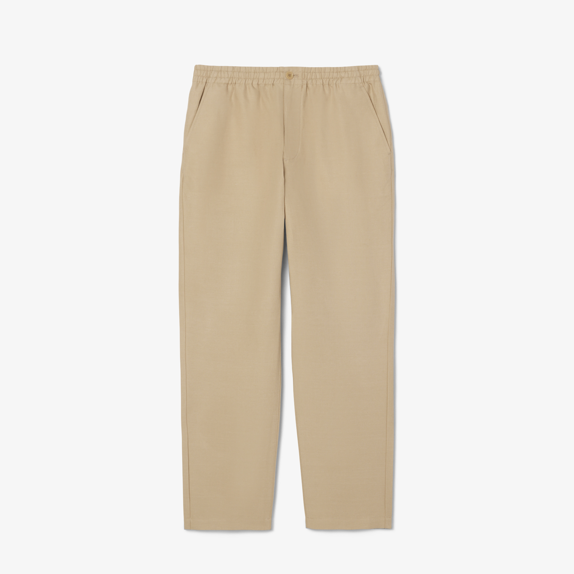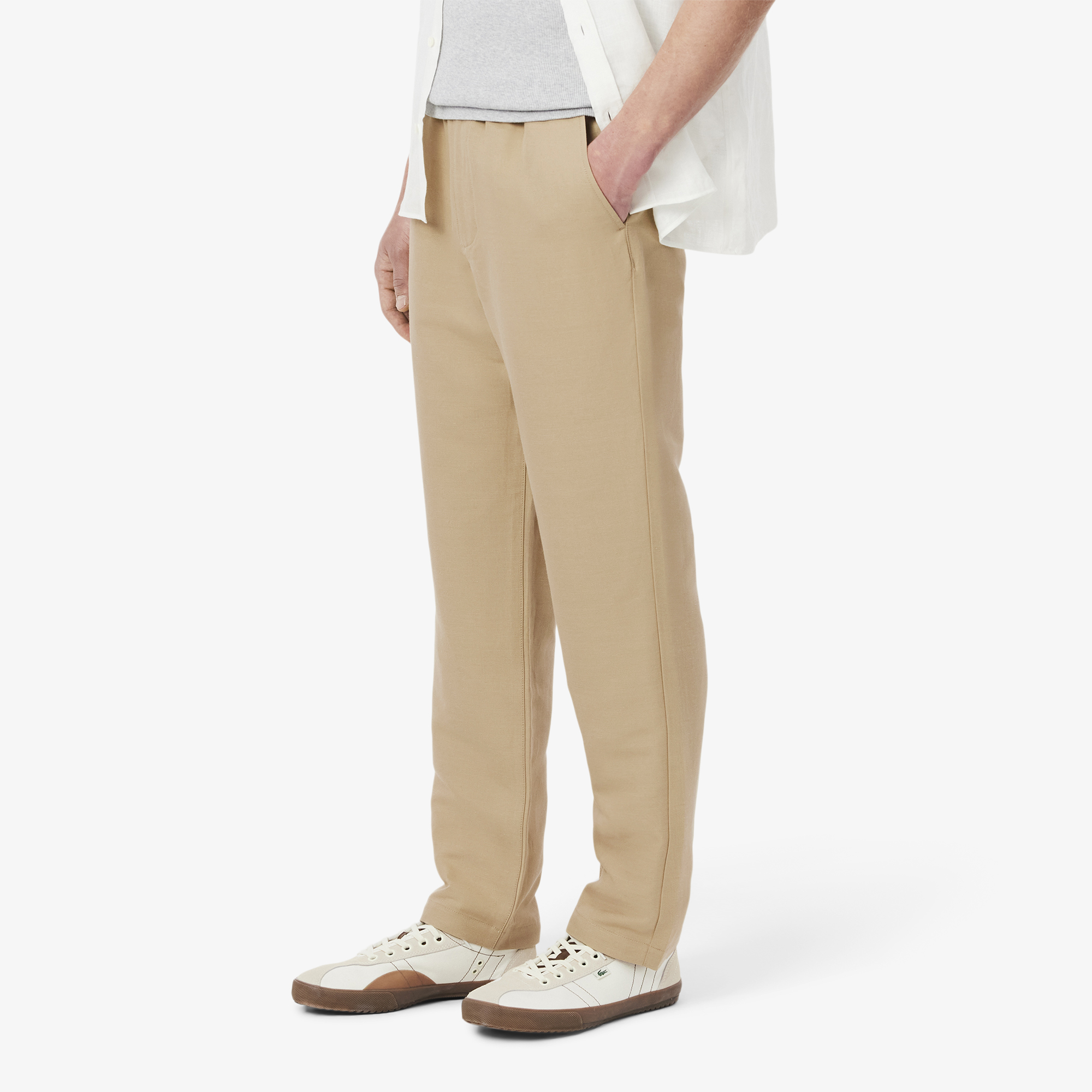 Брюки из льняной саржи Regular Fit \ Саржа из смеси льна \ Regular fit, прямой крой \ Итальянские карманы спереди \ Эластичная талия \ Вышивка логотипана заднем кармане \ Материал: 61% шерсть 31% вискоза 8% полиэстер