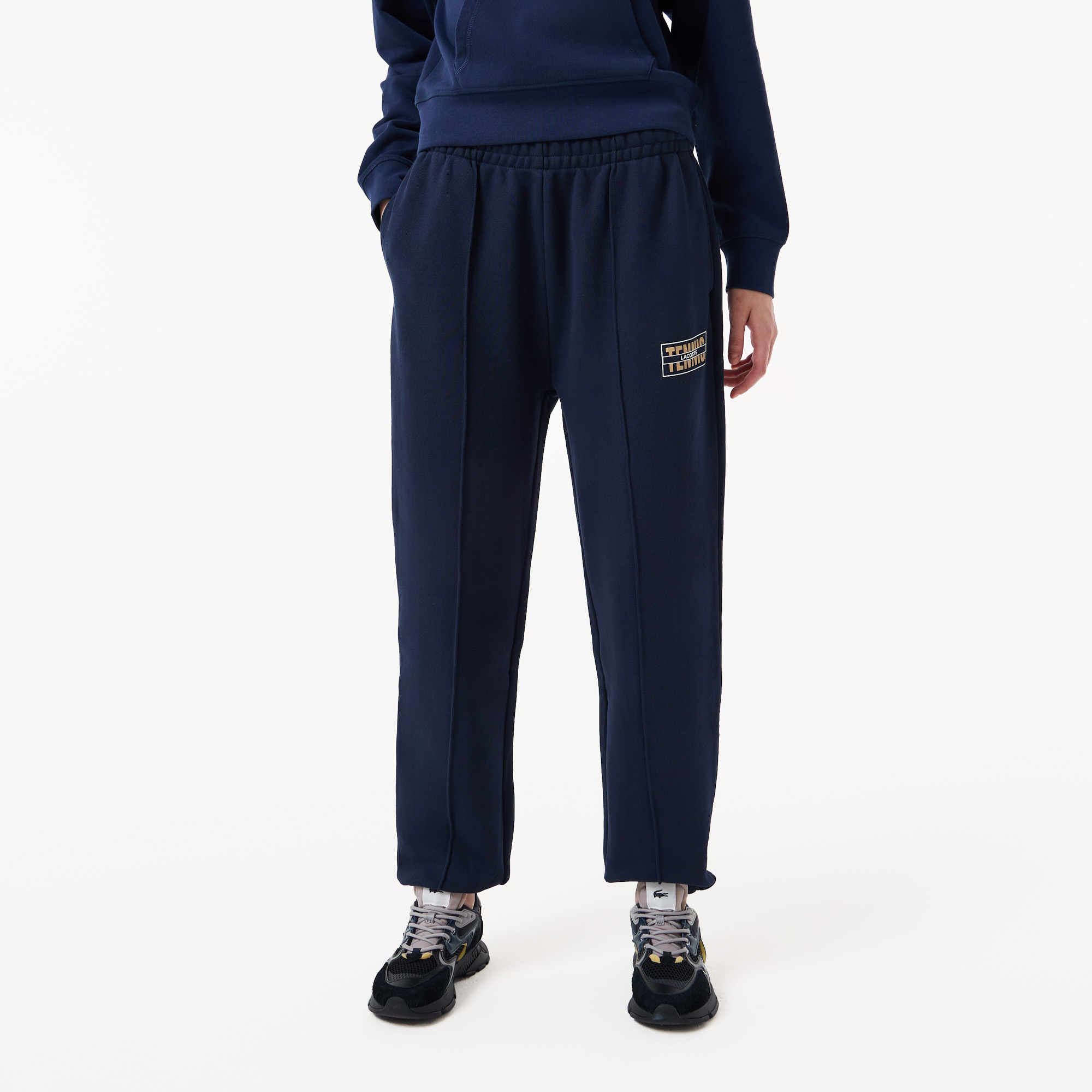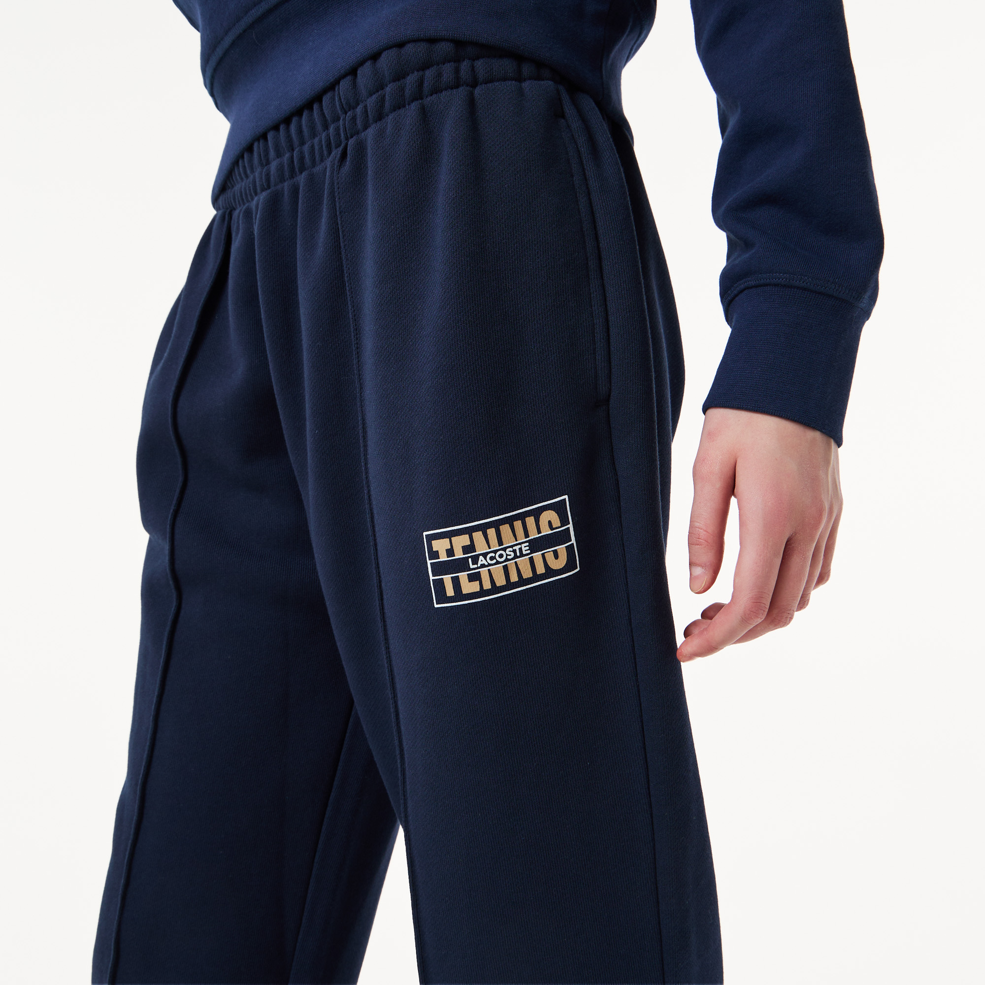 Хлопковые Спортивные брюки для бега трусцой с теннисным принтом \ Органический хлопок \ Завязки с логотипами \ Зауженные щиколотки \ Крокодил из переработанных материалов сзади \ Изделие большого размера. Мы советуем вам брать на размер меньше вашего обыч