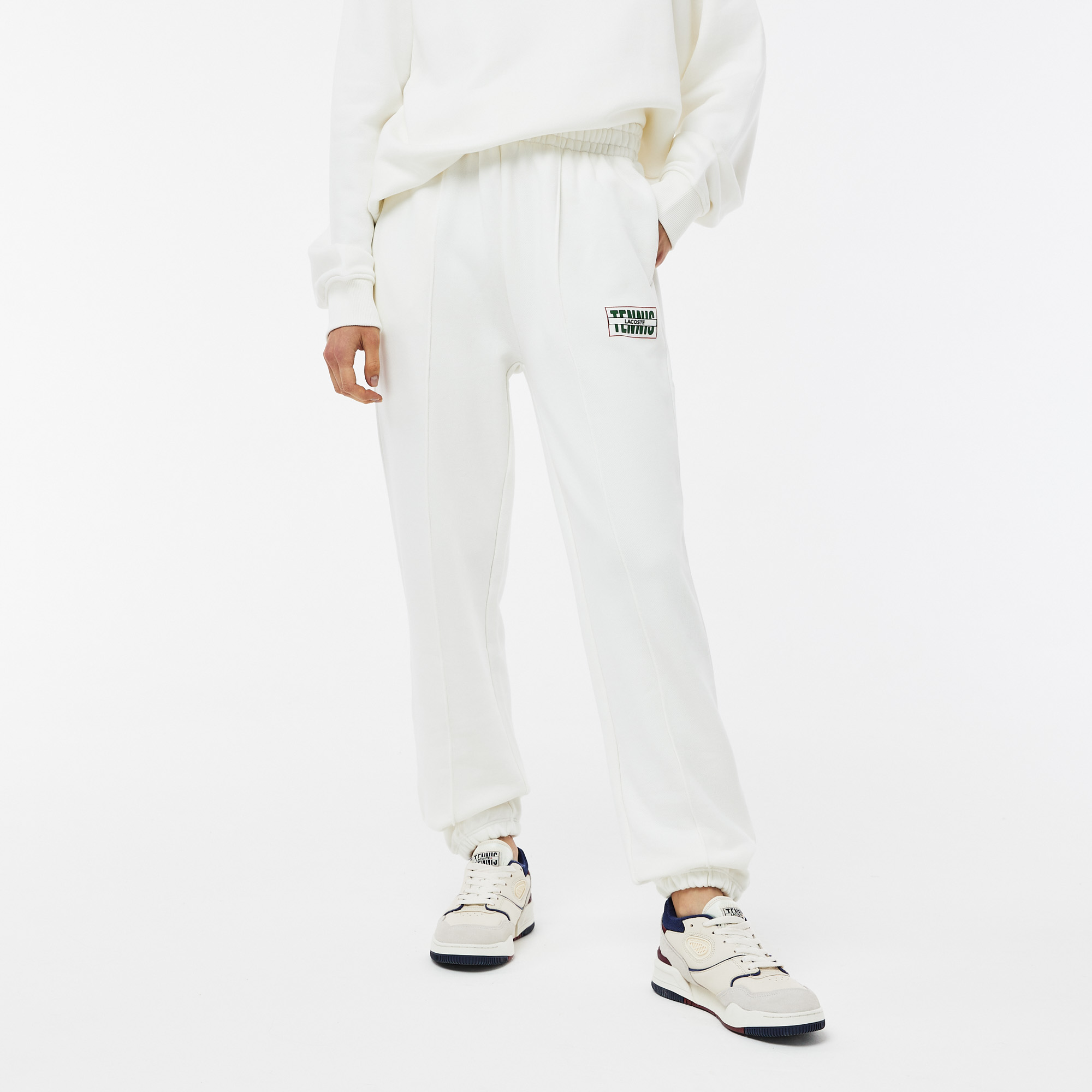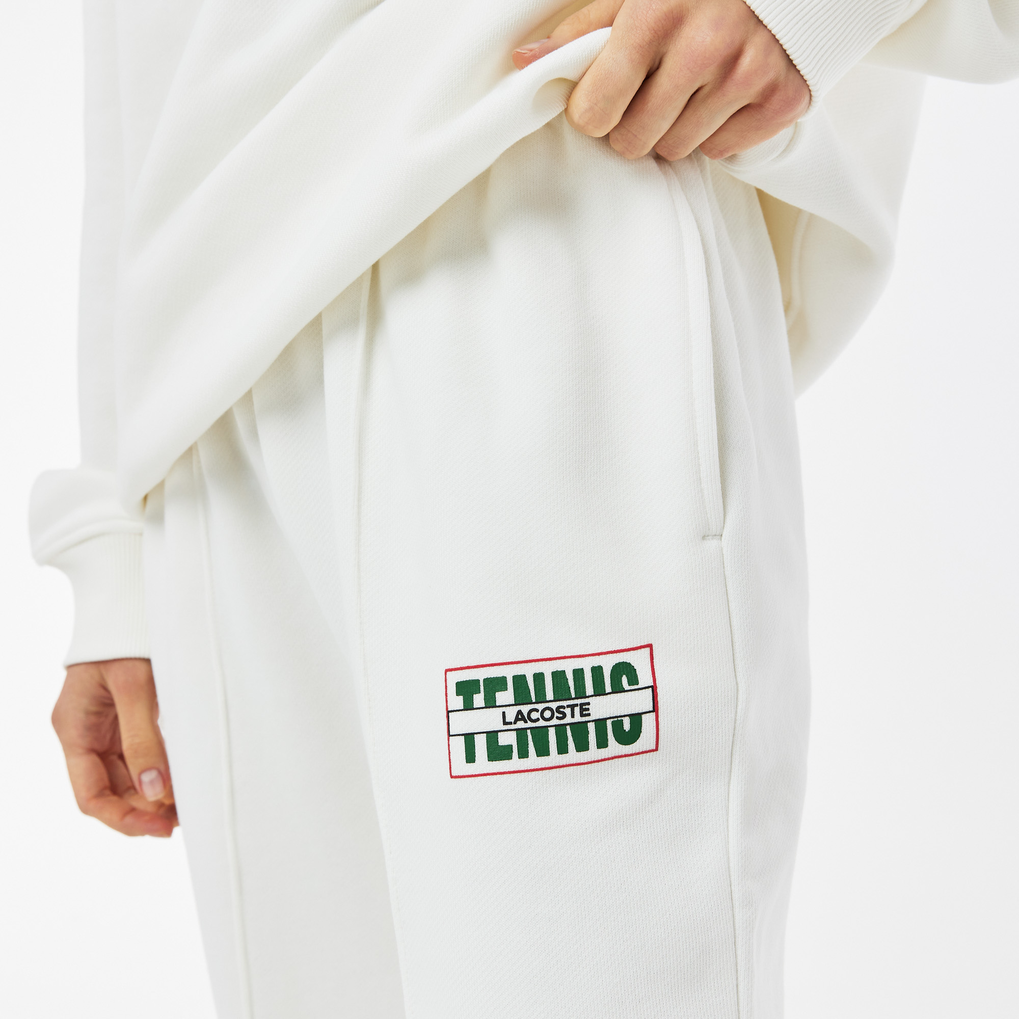 Хлопковые Спортивные брюки для бега трусцой с теннисным принтом \ Органический хлопок \ Завязки с логотипами \ Зауженные щиколотки \ Крокодил из переработанных материалов сзади \ Изделие большого размера. Мы советуем вам брать на размер меньше вашего обыч