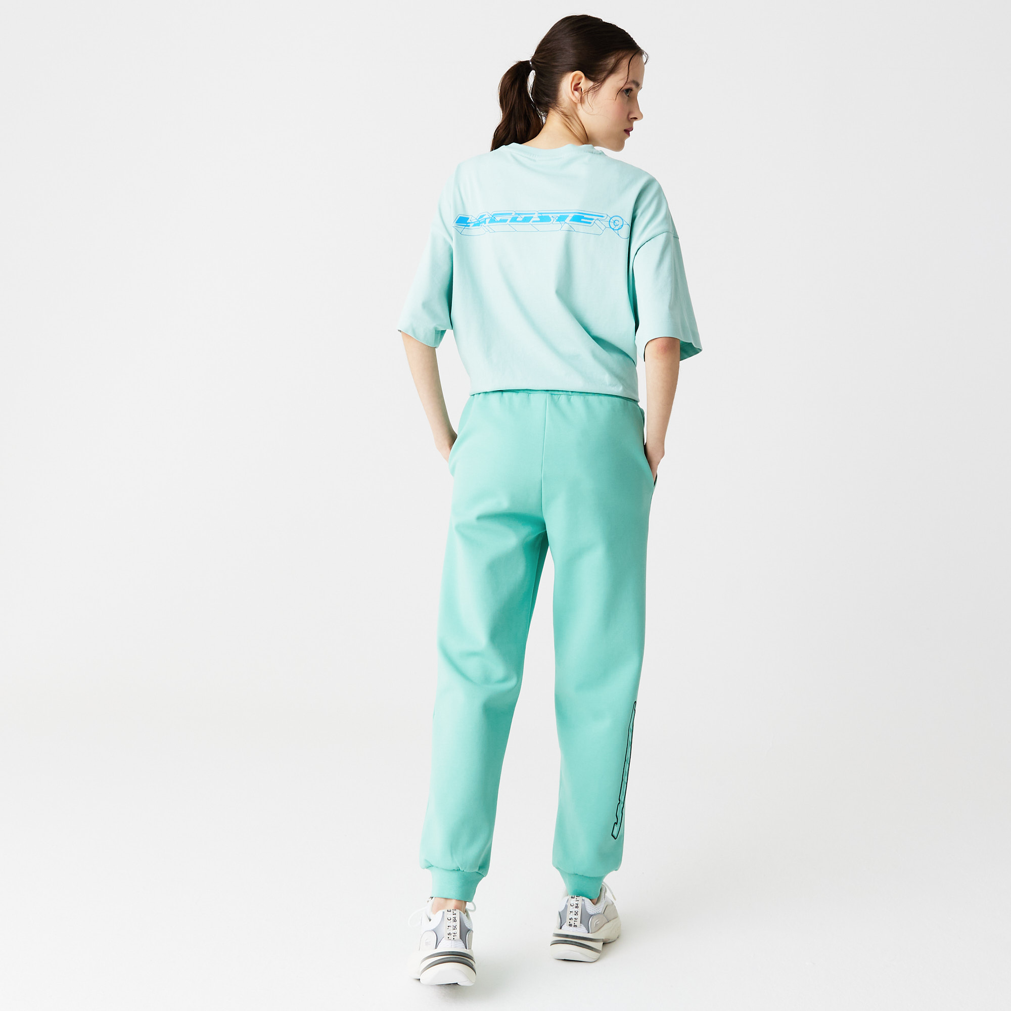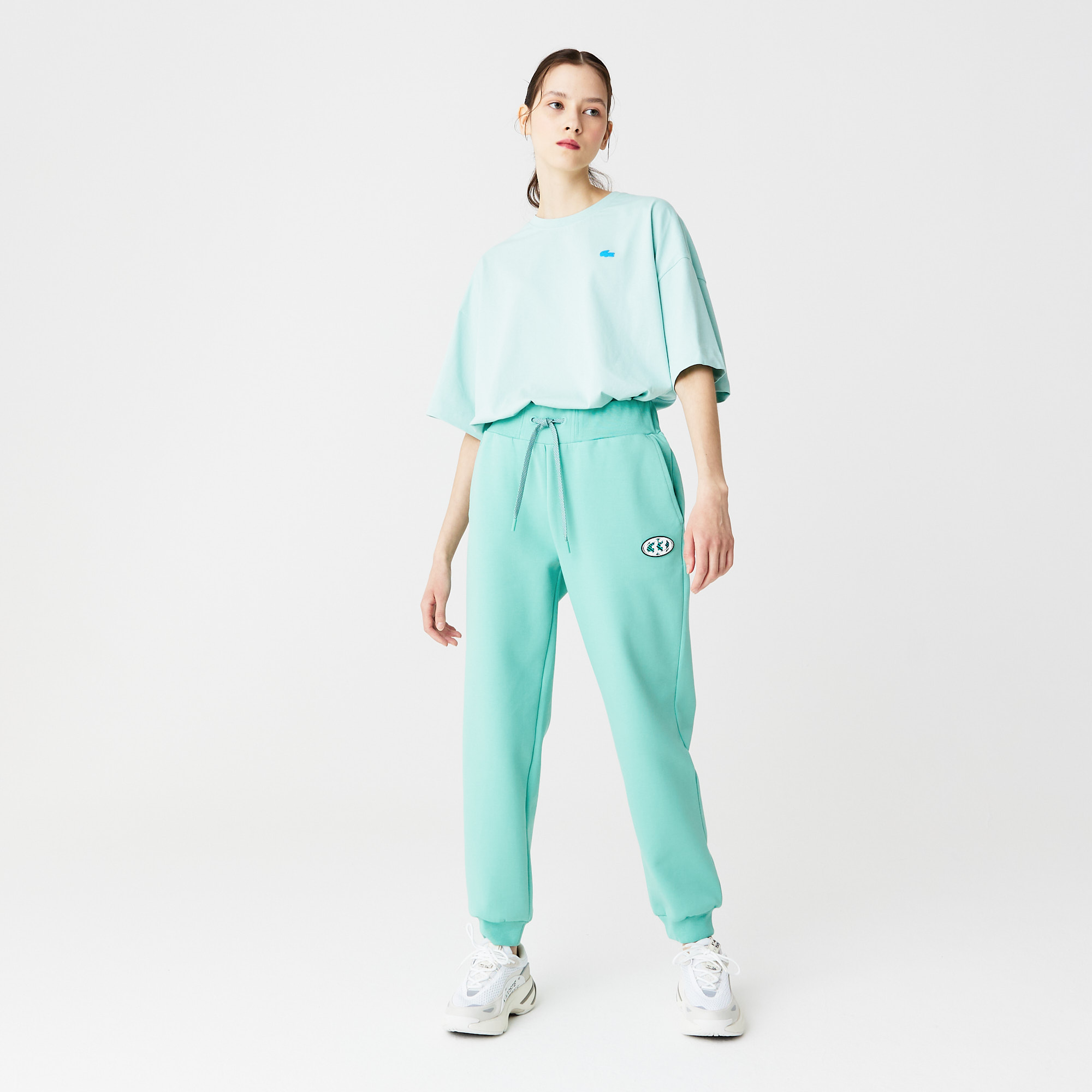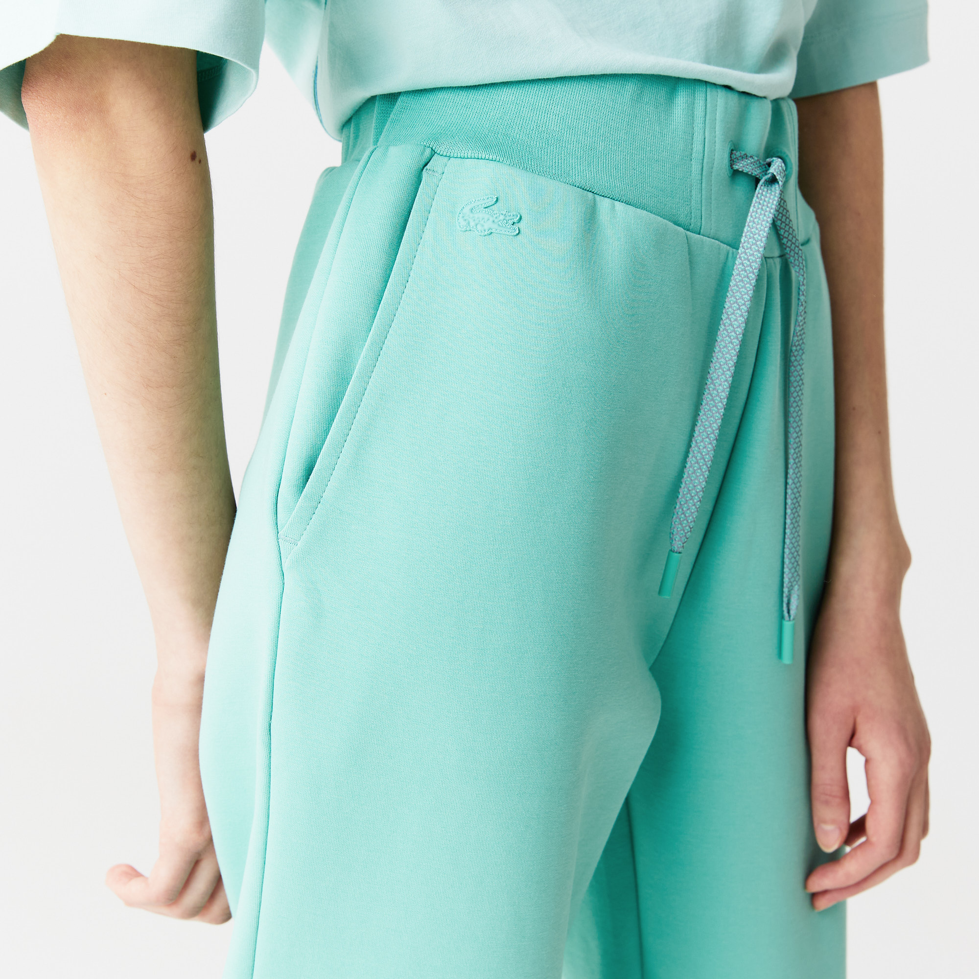 Регулируемая талия;\Боковые карманы;\Надпись "Lacoste" на нижней части штанины;\Вышитый логотип в тон изделия\Материал:80% хлопок 14% полиэстер 6% эластан