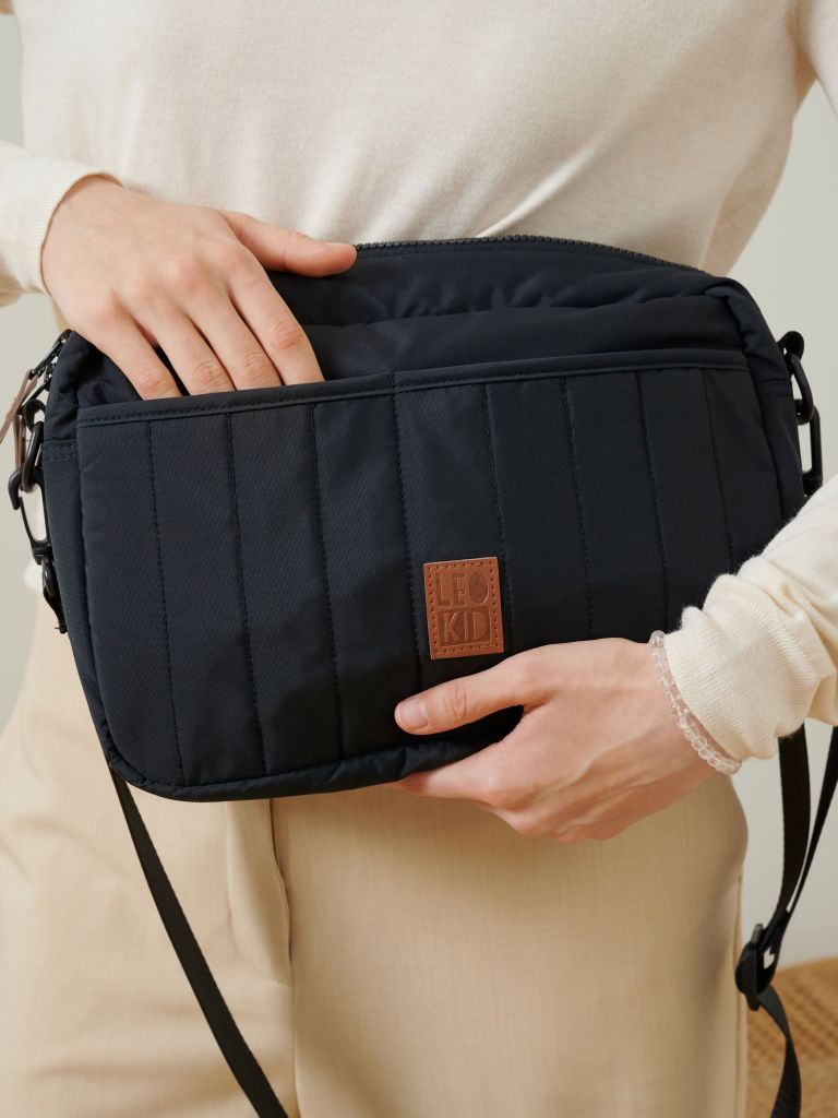 ксессуар выполнен из прочной ткани с водоотталкивающей пропиткой и легко крепится на ручке коляски одним из двух способов: с помощью липучек и карабинов или с помощью основного ремешка. Его также можно носить в руках или на плече.