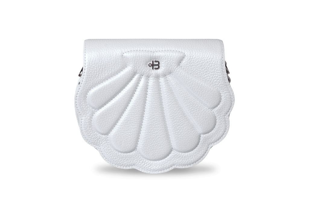 Аксессуар выполнен в виде полукруга с рельефной передней стороной в форме ракушки. Его главная особенность — перламутровая белая кожа. Этот материал не только редкий, но и визуально уникальный — он отсылает к морской теме, придавая аксессуару мягкое жемчужное свечение.