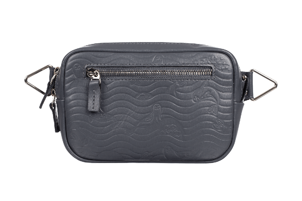 Bumbag — поясная сумка унисекс из натуральной кожи. Закрывается на надежную молнию. Ремень из текстиля легко регулируется по длине и пристегивается к сумке с помощью карабинов. В аксессуаре есть один внешний и один внутренний карман, в которых можно расположить важные мелочи. С оборотной стороны есть ручка, благодаря которой аксессуар можно носить в руке. Украшает сумку оригинальное тиснение с нерпами.