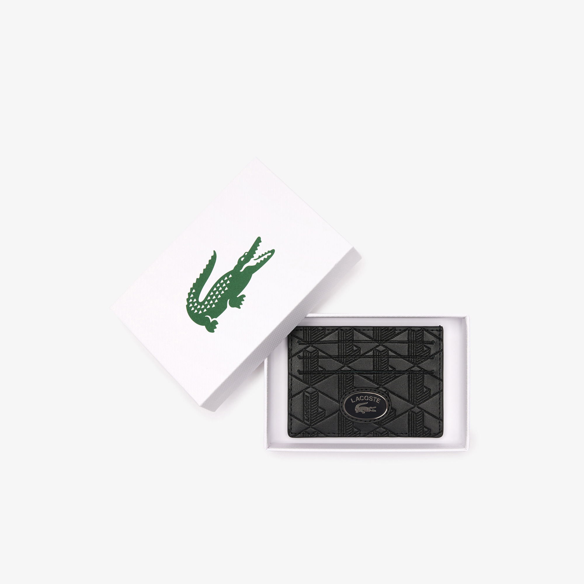 Кожаный держатель для карт с монограммой \ Размеры: L4.1 x H3 x D0.2 " / L10.5 x H7.7 x D0.5 см \ Снаружи из расщепленной телячьей кожи \ 1 плоский карман, 6 слотов для карт \ Эмалированная табличка с логотипом крокодила \ Материал: 100% коровья кож