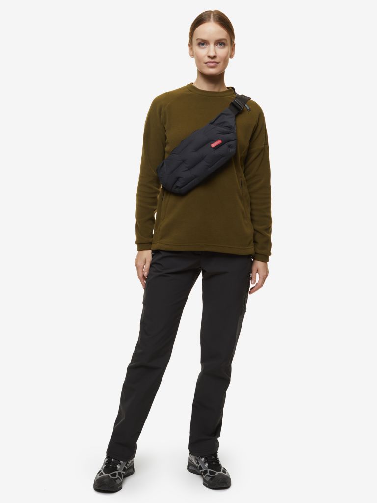 Теплая поясная сумка-муфта из секционной эластичной ткани. Пуховые секции соединены с помощью бесшовной технологии, которая исключает миграцию пуха, повышает водостойкость изделия и продлевает срок службы.