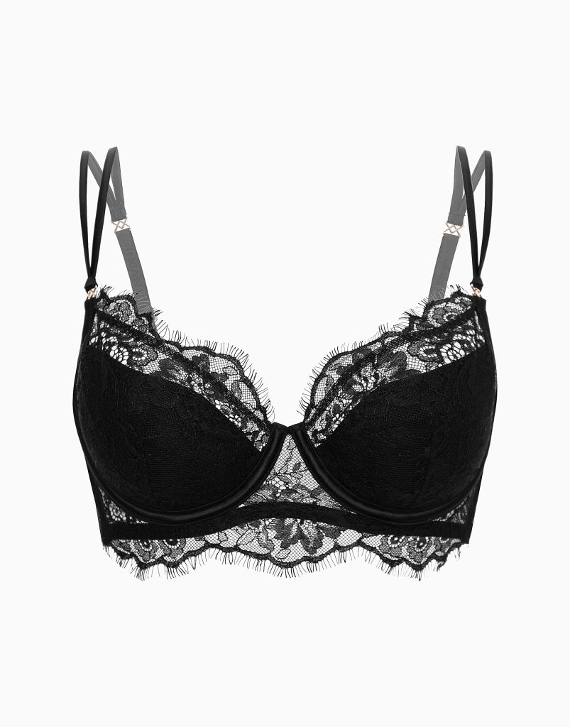 Бюстгальтер с мягкими чашками и усилителем из спонжа на стане. Верхняя часть чашек выполнена из тонких прозрачных материалов, что добавляет особую пикантность образу.