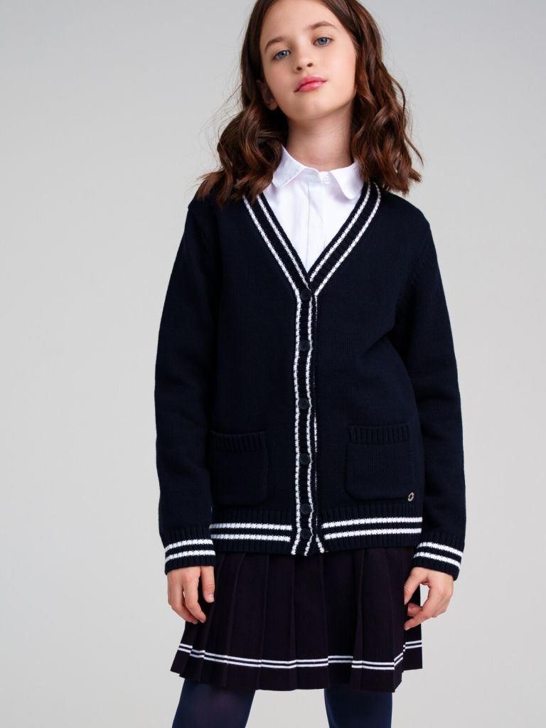 Классический синий школьный кардиган для девочки подростка. Кардиган прямого силуэта на пуговицах выполнен из вязаного трикотажа с высоким содержанием хлопка. Кофта в школу выглядит стильно, благодаря лаконичному дизайну. Функциональные боковые карманы. Рубашка, футболка или поло + кардиган для школьницы составят красивый элегантный комплект для школы.